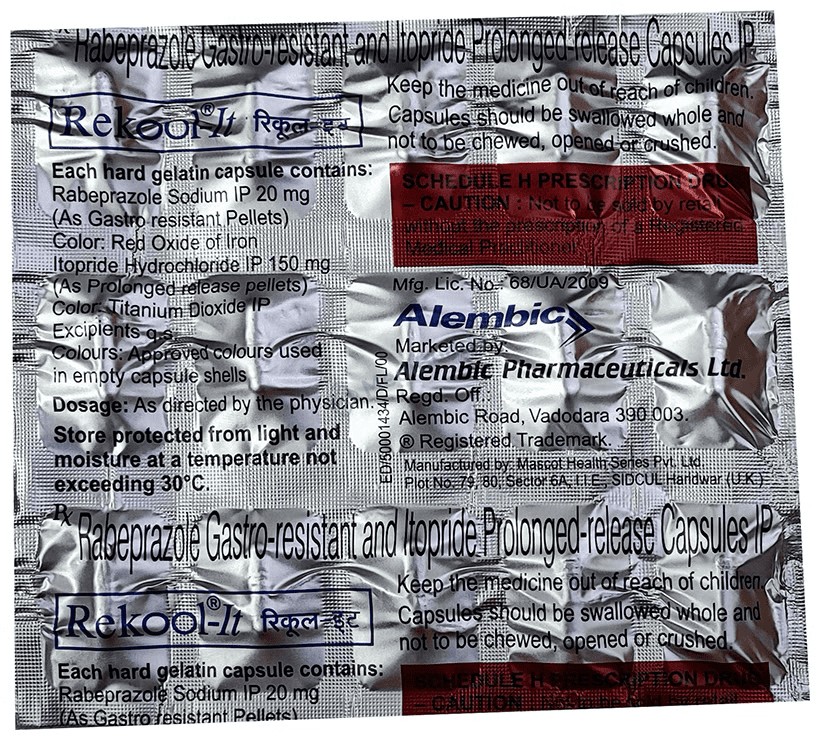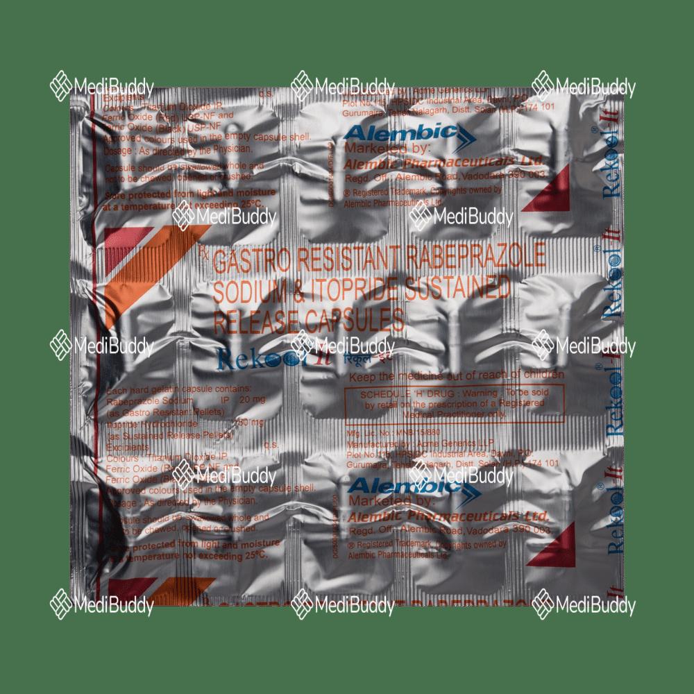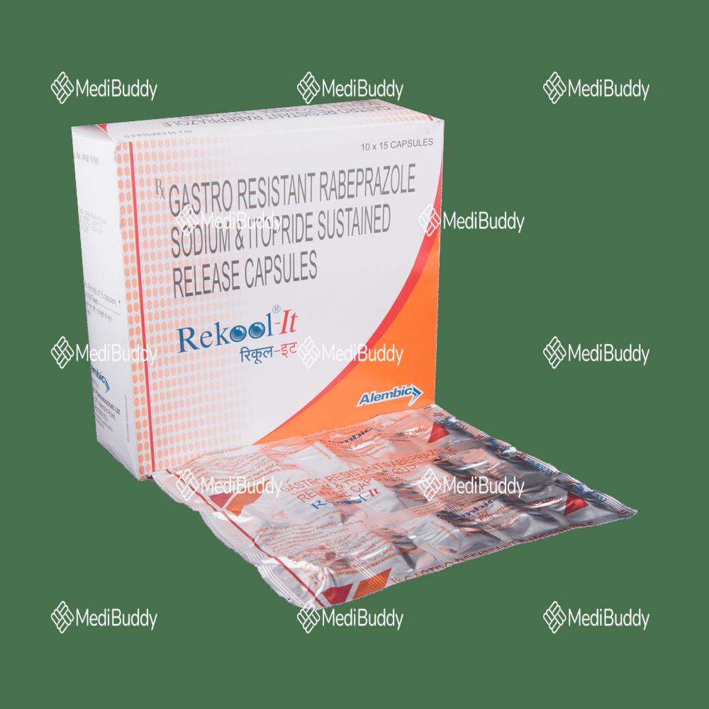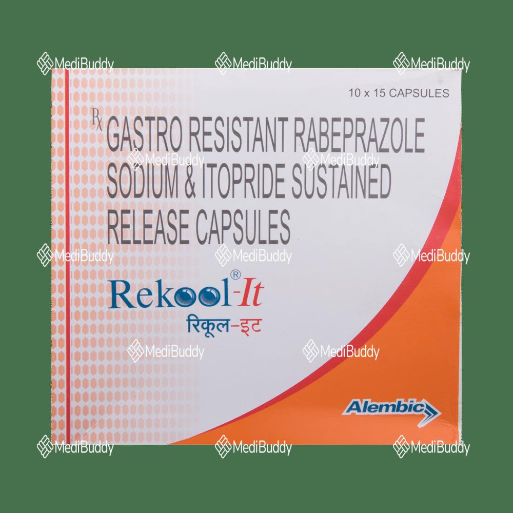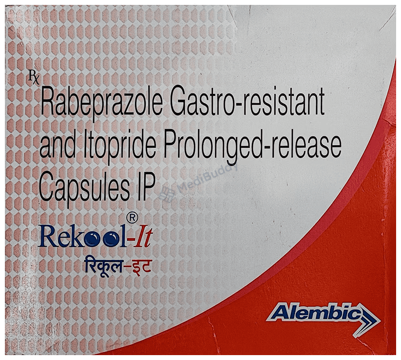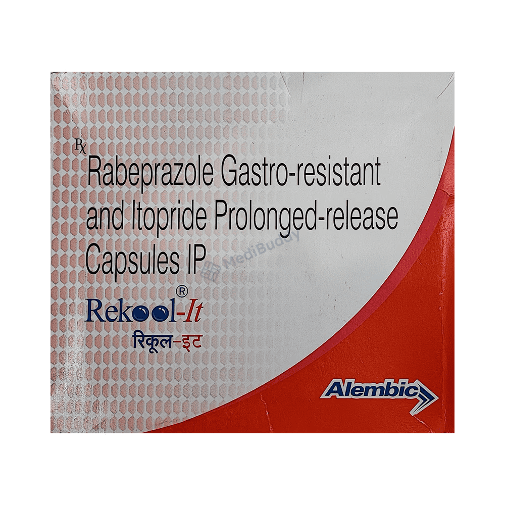 Rekool-IT Capsule PR is a combination medication utilized for treating gastroesophageal reflux disease (also known as acid reflux) and peptic ulcer disease. These conditions manifest through symptoms such as heartburn, stomach pain, and irritation due to increased stomach acidity. This medicine not only relieves these symptoms but also neutralizes the acid, facilitating the smooth passage of gas to alleviate stomach discomfort. It contains Rabeprazole and Itopride as active ingredients, which work together to lower stomach acid levels and provide relief from acid-related issues.
