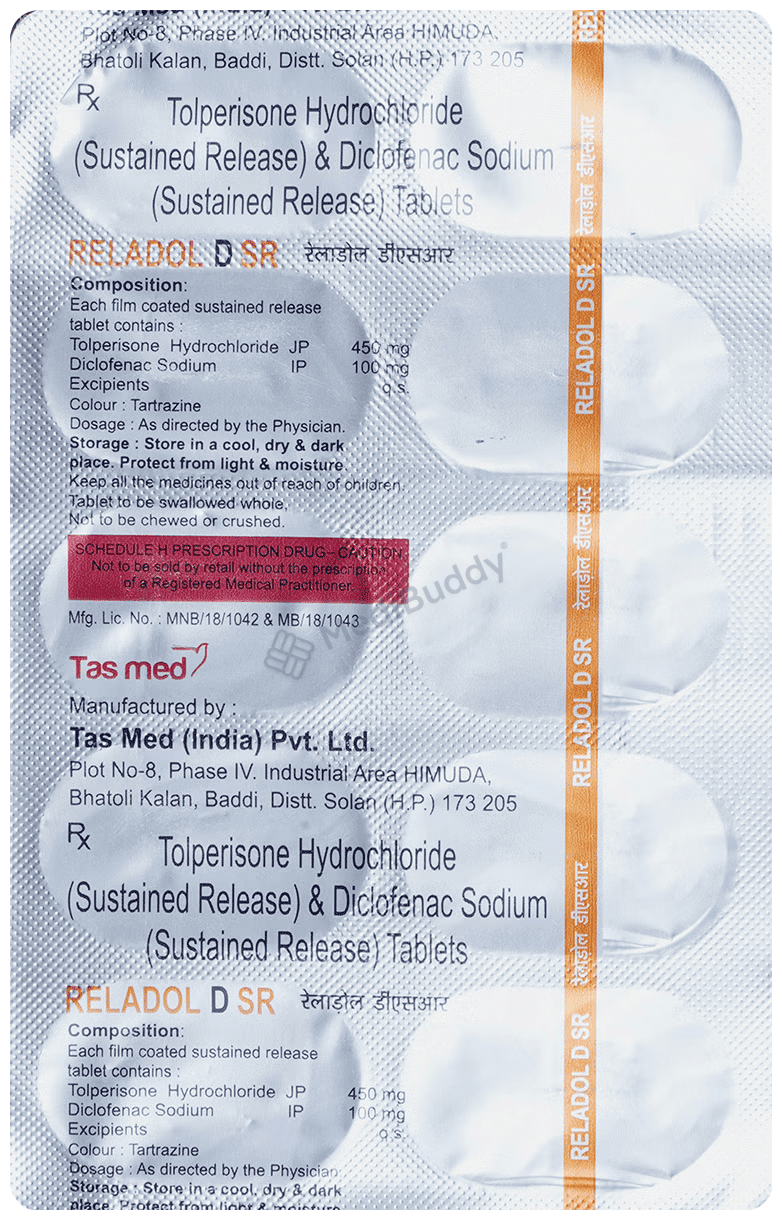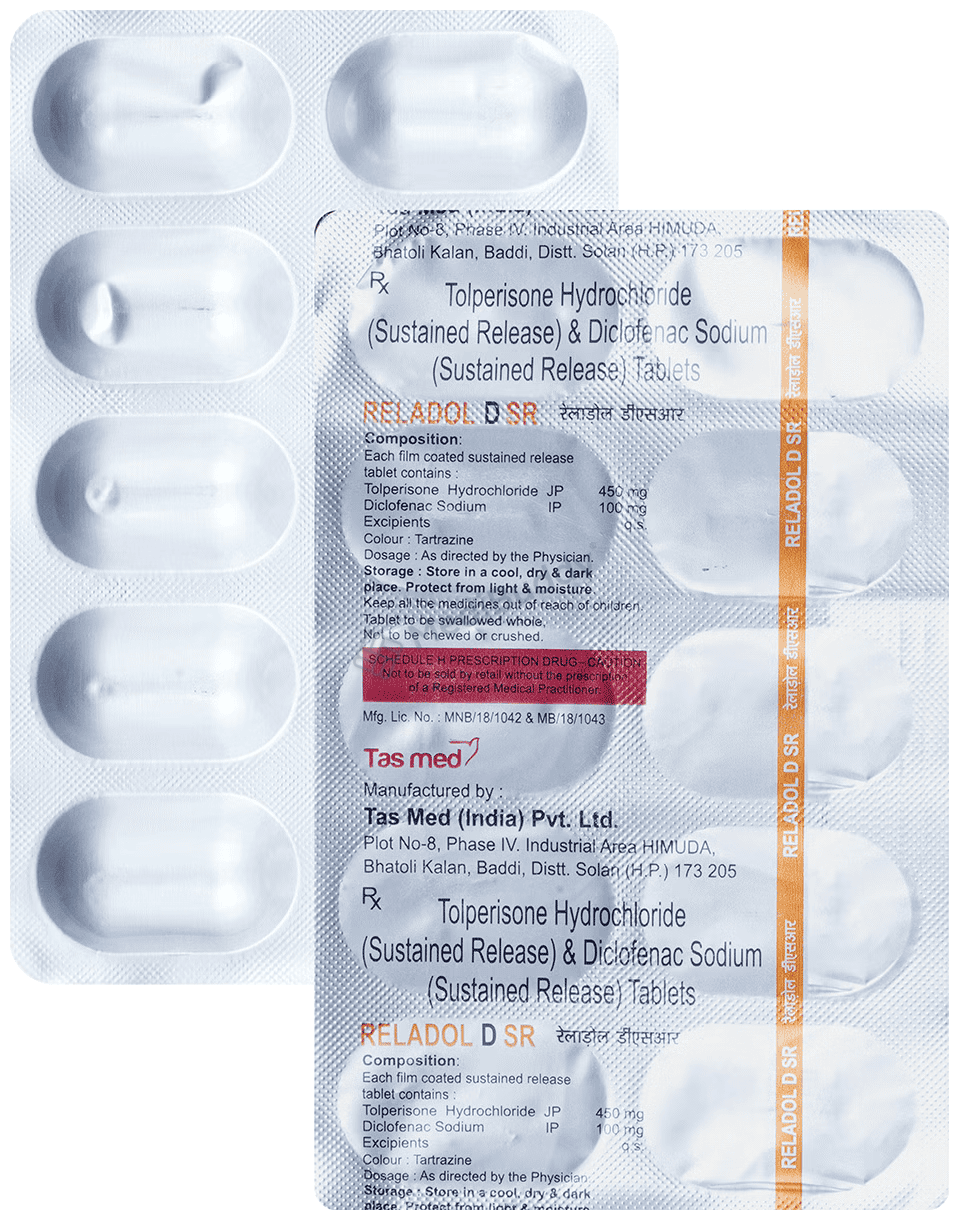 Reladol D 450mg/100mg Tablet SR is used to treat pain caused by muscle spasm. It works by relaxing stiff muscles and reducing muscle swelling, which helps improve muscle movement and lessen discomfort. It is important to take this medicine with food to avoid stomach upset. Common side effects include nausea, vomiting, diarrhea, and weakness. Inform your doctor if these side effects persist. Before using this medicine, discuss with your doctor if you have heart, kidney, or liver issues. Pregnant or breastfeeding individuals should consult their doctors before use.