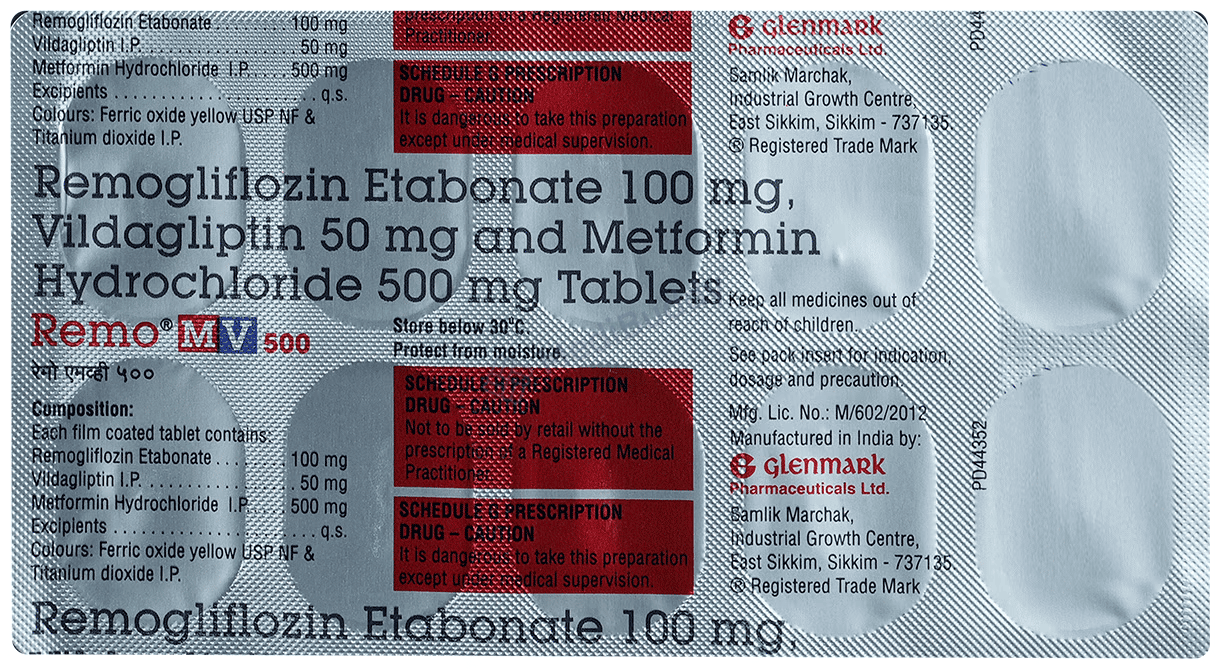 Remo MV 500 Tablet is a powerful combination medication designed to help manage blood sugar levels in adults with type 2 diabetes mellitus. This condition, also known as non-insulin-dependent or adult-onset diabetes, occurs when the body struggles to regulate glucose due to a lack of insulin or insensitivity to it. The tablet contains three key ingredients: Remogliflozin, Vildagliptin, and Metformin. Remogliflozin etabonate aids in eliminating excess sugar through urine, while Metformin reduces sugar production and absorption while increasing insulin sensitivity. Vildagliptin helps lower blood glucose levels and boosts insulin release from the pancreas. Together, these components work synergistically to help control blood sugar levels effectively.