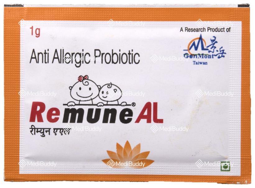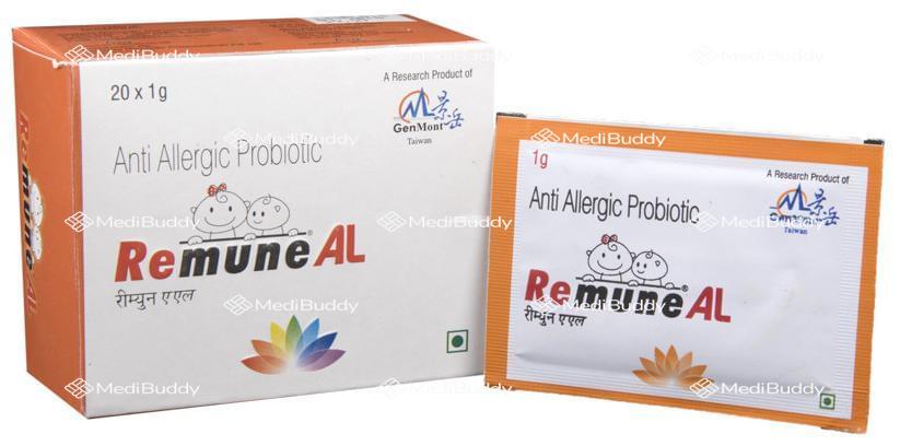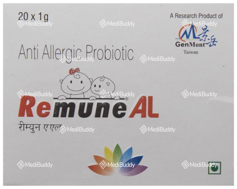 Remune AL Sachet is an anti-allergic probiotic supplement designed to help reduce the frequency and severity of allergy symptoms commonly seen in conditions such as allergic rhinitis, allergic asthma, and atopic dermatitis. This supplement contains key ingredients like Lactobacillus paracasei and Lactobacillus fermentum, which target the root cause of allergies.