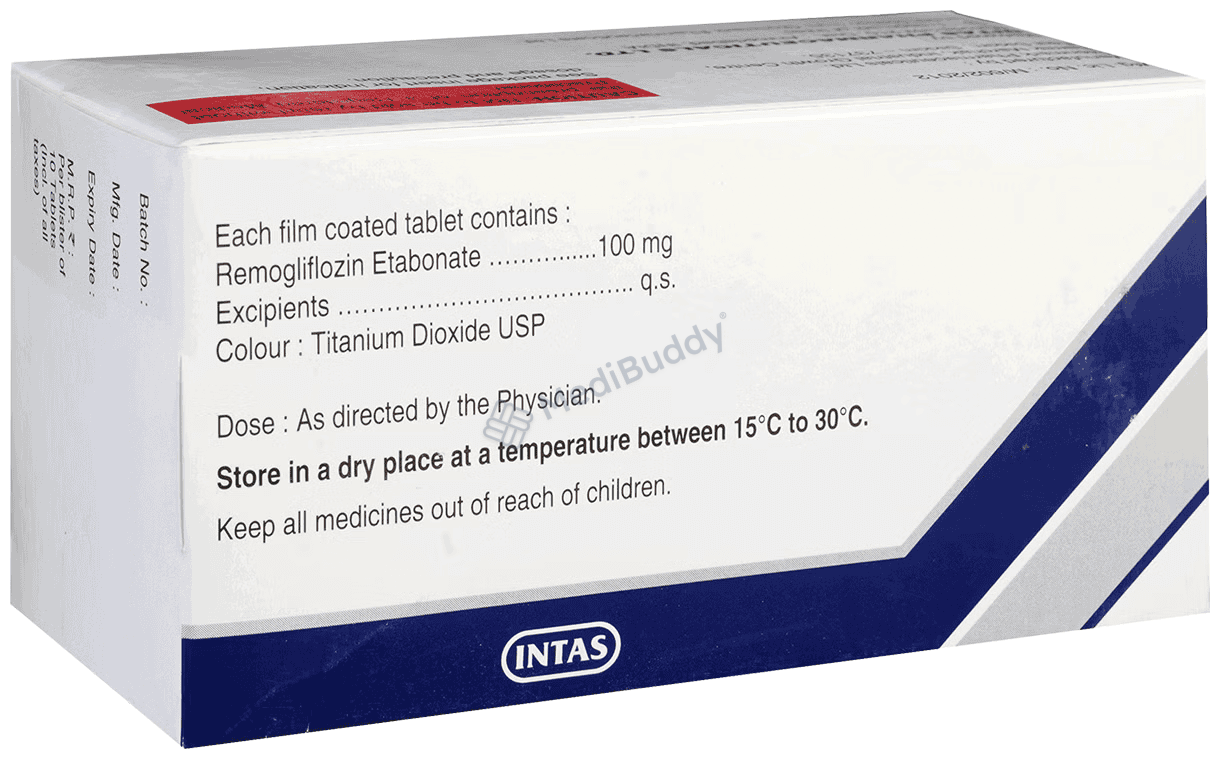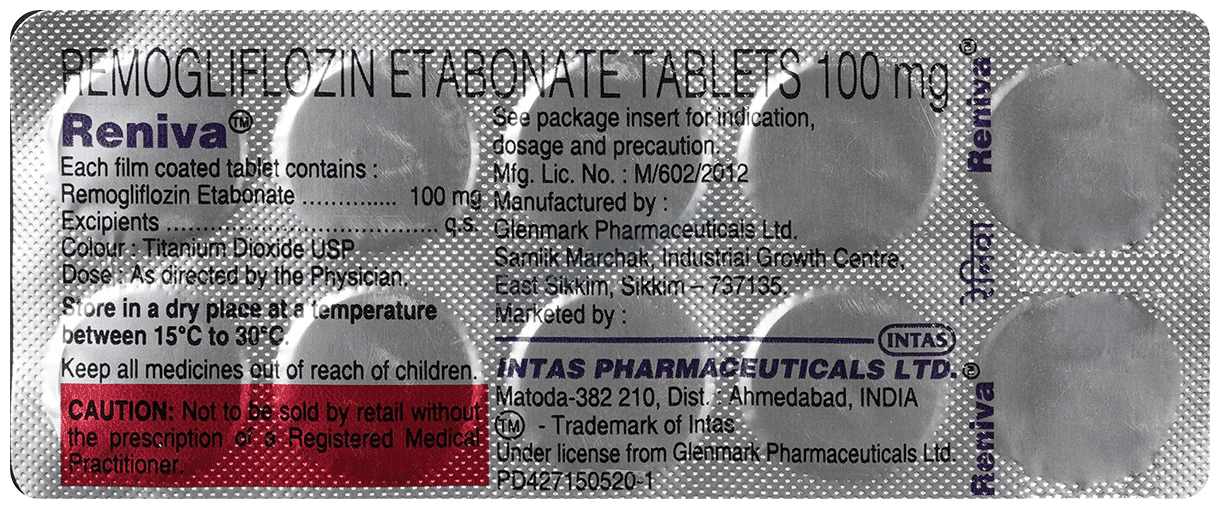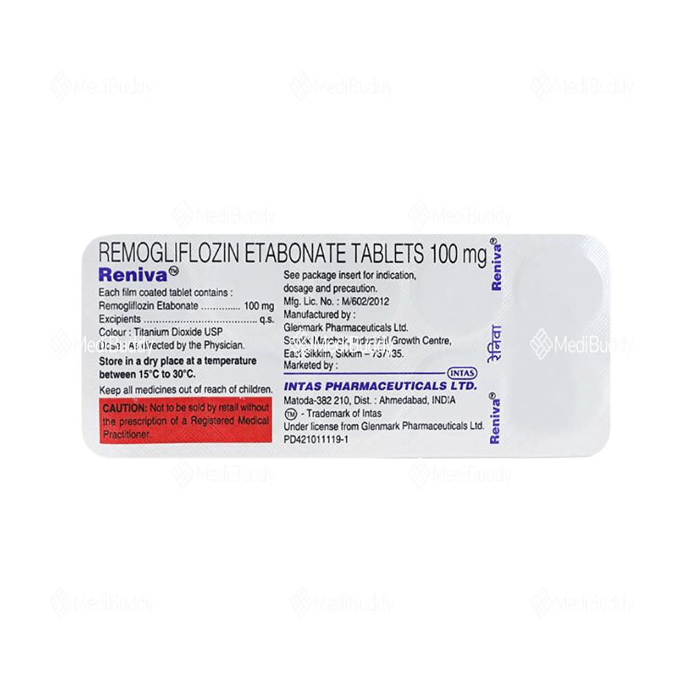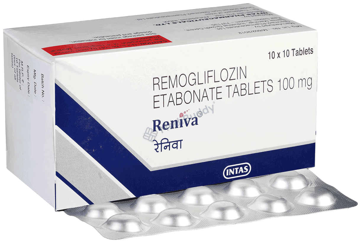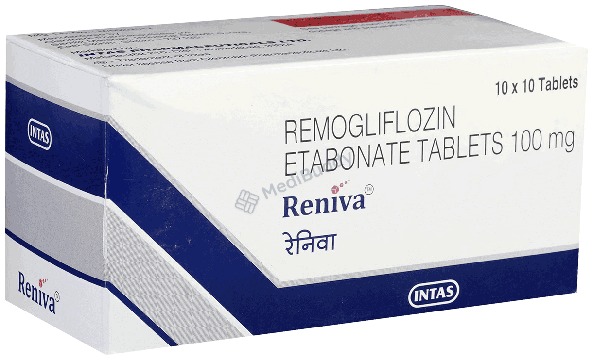 Reniva 100mg Tablet, containing the active ingredient Remogliflozin Etabonate, belongs to the class of gliflozins and acts as a sodium-glucose transporter 2 inhibitor. It works by eliminating excess sugars from the body through urine, thereby helping to improve glycemic control in patients with type 2 diabetes. This medication may also reduce the risk of heart failure in individuals with diabetes and heart conditions. Consulting a doctor before starting or discontinuing Reniva 100mg Tablet is essential for optimizing treatment outcomes.