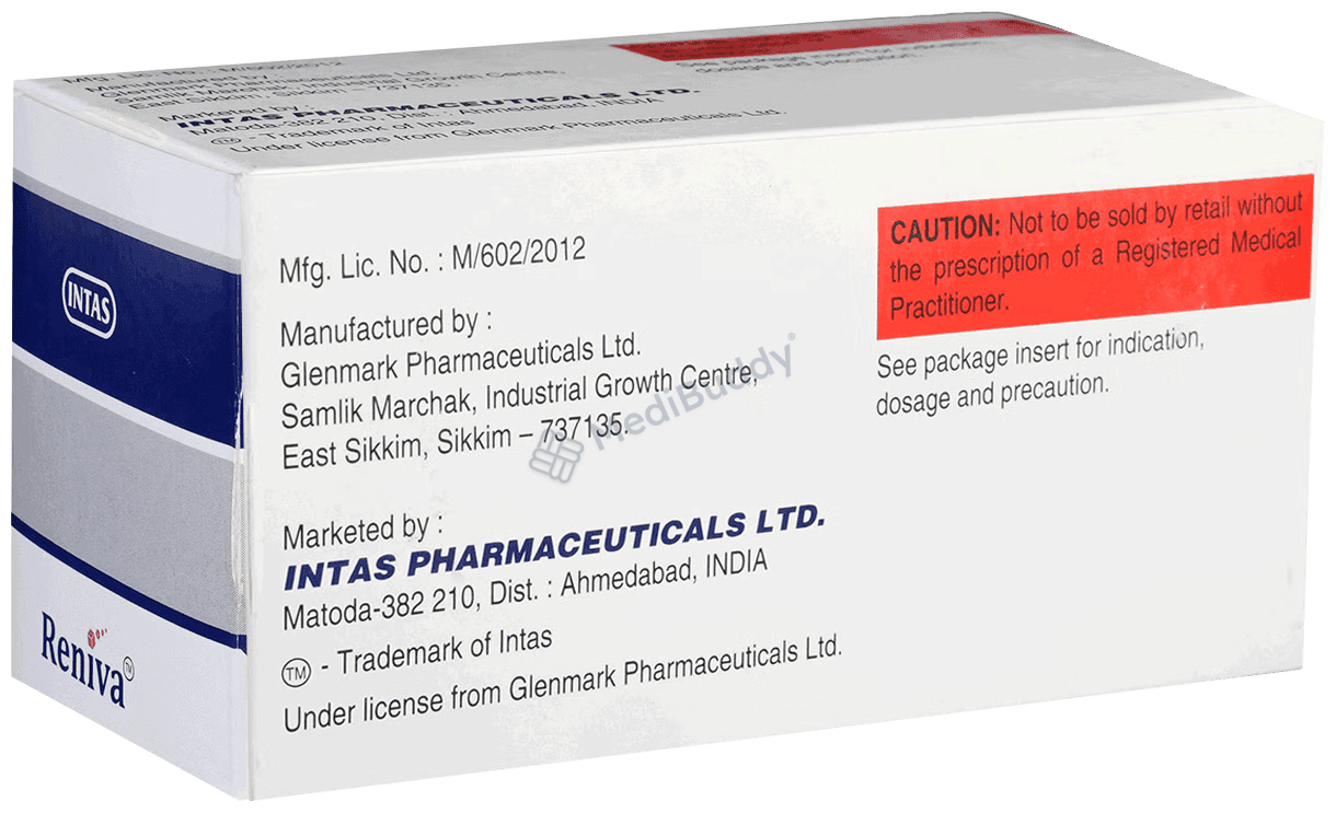 If you forget to take a dose of Reniva 100mg Tablet, take it as soon as you remember. But if it's close to the time for your next dose, just skip the missed one and continue with your usual schedule. Make sure not to double up on doses to make up for the missed one.