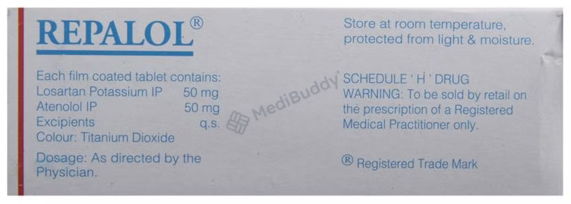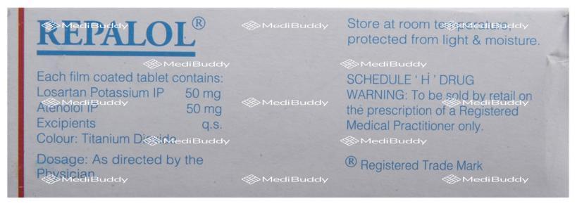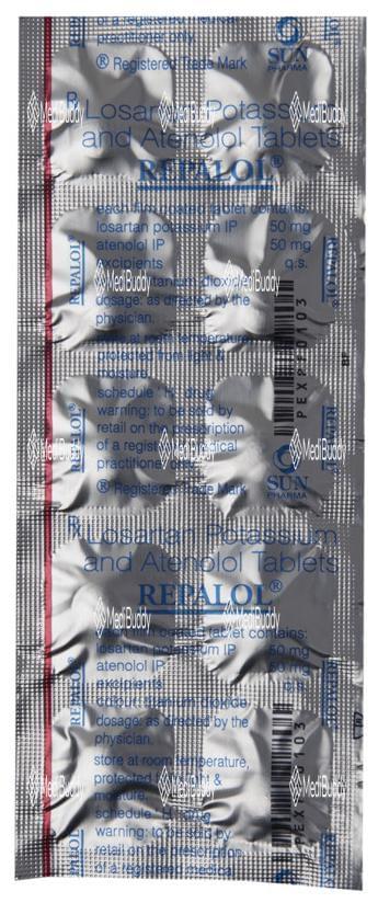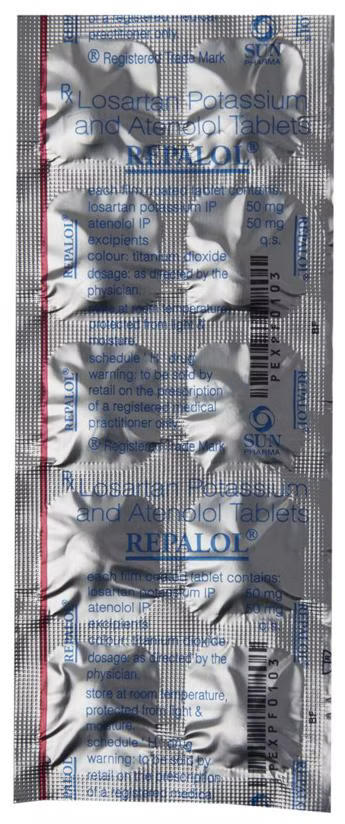 Repalol Tablet is a medication used to treat hypertension (high blood pressure) by relaxing the blood vessels, allowing for easier blood flow throughout the body. It works by blocking certain chemicals that affect the heart and blood vessels, resulting in a slower heart rate and reduced force of heartbeats. By effectively lowering blood pressure, this medication helps reduce the risk of potential serious conditions such as stroke, heart attack, and kidney problems in the future. Repalol Tablet contains a combination of two active ingredients, Losartan and Atenolol. Losartan acts on angiotensin II, a hormone that narrows blood vessels, thus improving blood flow and lowering blood pressure. Additionally, Losartan offers kidney protection for those with kidney disease and diabetes. Atenolol, on the other hand, works by blocking stress hormones like adrenaline and epinephrine, which helps in slowing down heart rate. This combined action of the two components makes Repalol Tablet an effective treatment for hypertension, decreasing the likelihood of heart-related issues and improving overall cardiovascular health. It is important to take this medication regularly as prescribed by your healthcare provider to experience its full benefits and to maintain optimal blood pressure levels. Remember not to discontinue its use without consulting your doctor to ensure your condition remains under control.