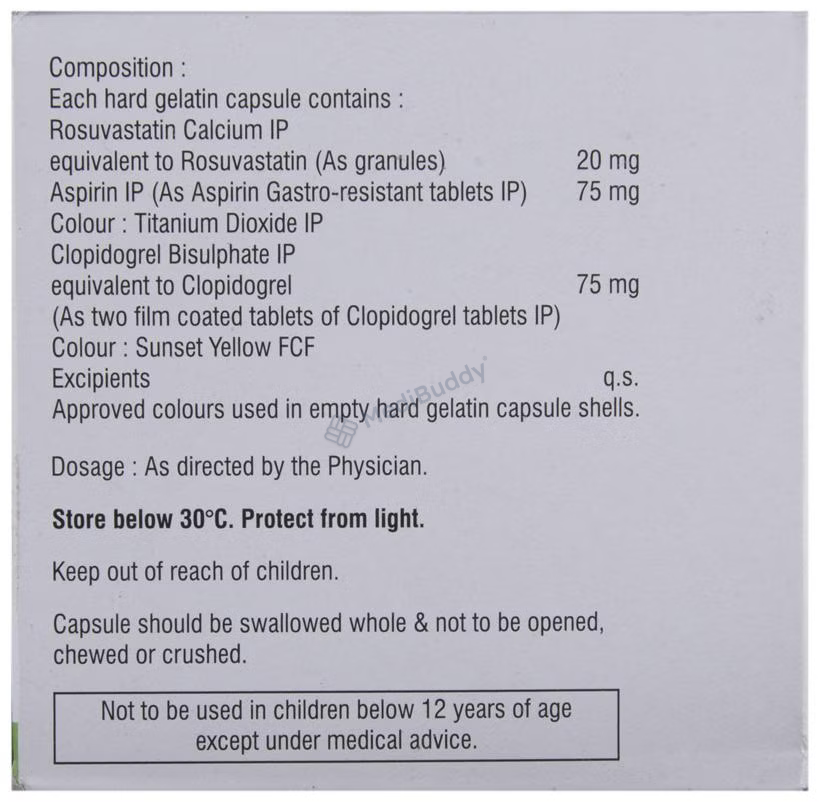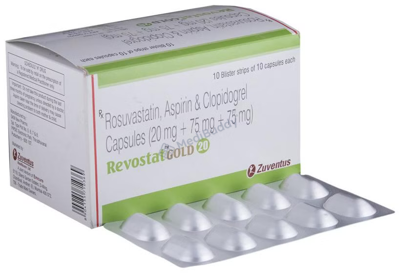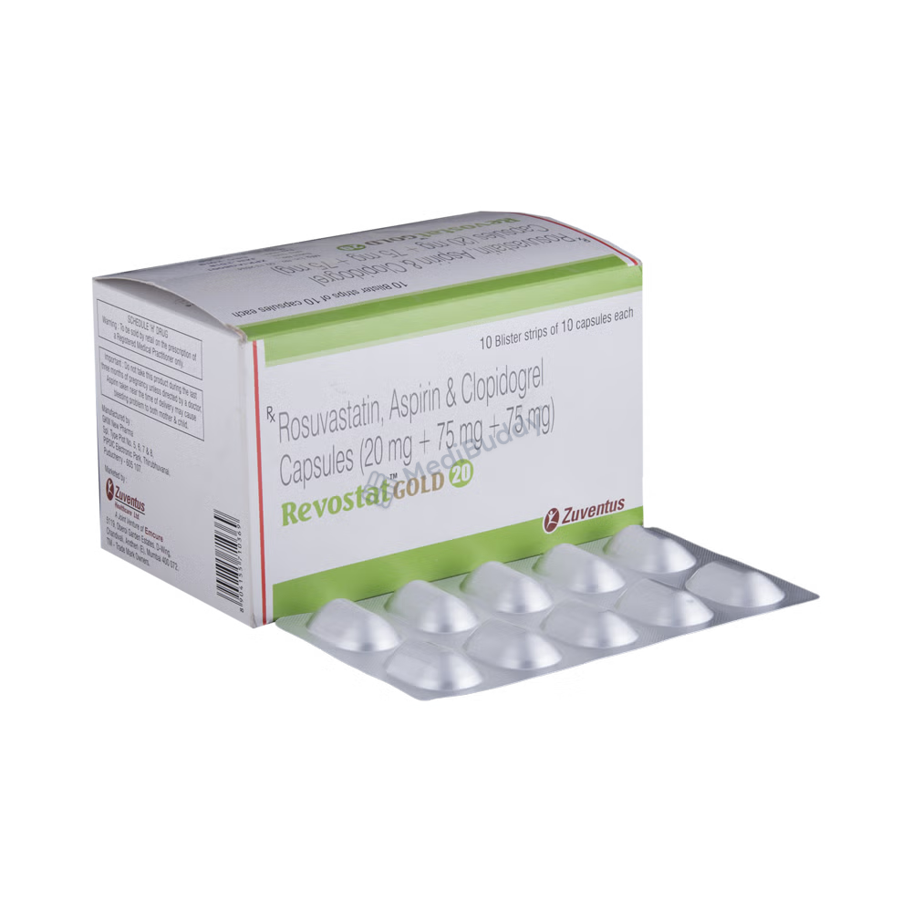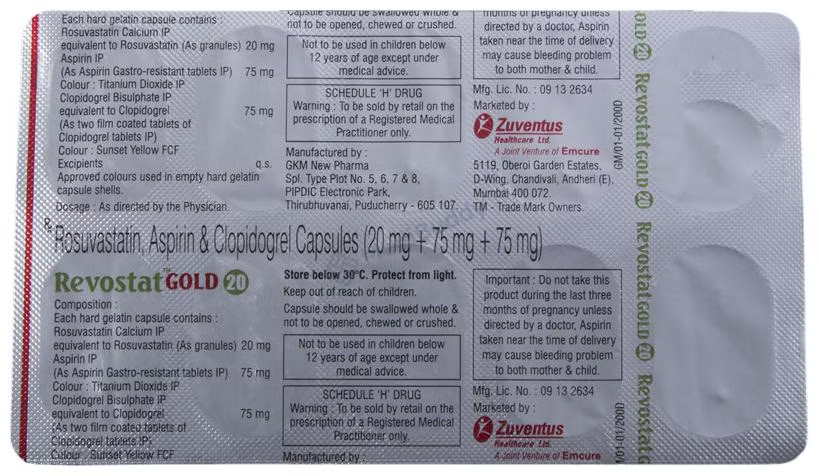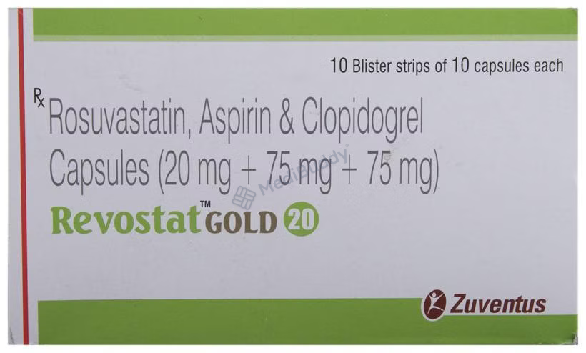 REVOSTAT GOLD 20MG CAPSULE, a combination of Aspirin, Clopidogrel, and Rosuvastatin, falls under the categories of Antiplatelets and HMG-CoA reductase inhibitors. It is indicated for the treatment of conditions such as acute coronary syndrome, heart attack, angina, and stroke caused by clot or plaque formation in the blood vessels supplying the heart. Symptoms of acute coronary syndrome include heart attack, chest pain, shortness of breath, and sweating. Following a healthy low-fat diet while taking REVOSTAT GOLD 20MG CAPSULE can lead to improved outcomes. Avoiding alcohol consumption is advised during therapy to reduce the risk of bleeding in the gastrointestinal tract. This medication is not recommended for individuals with severe liver, kidney, or heart conditions and pregnant or breastfeeding women. Common side effects include increased bleeding tendency, nausea, indigestion, muscle pain, headache, and dizziness. Promptly inform your doctor if these symptoms worsen.