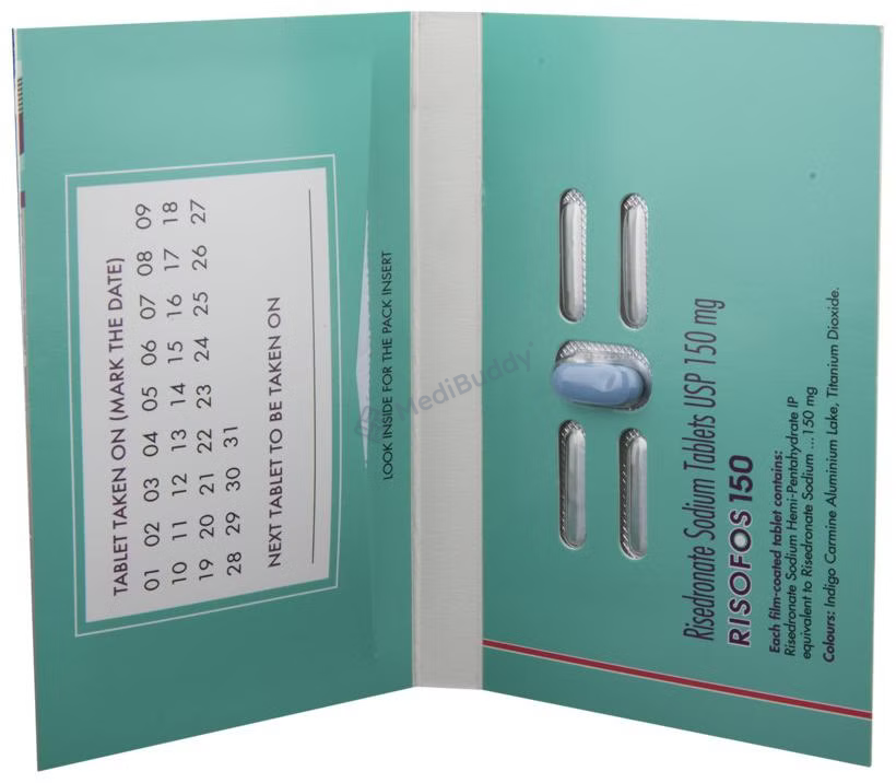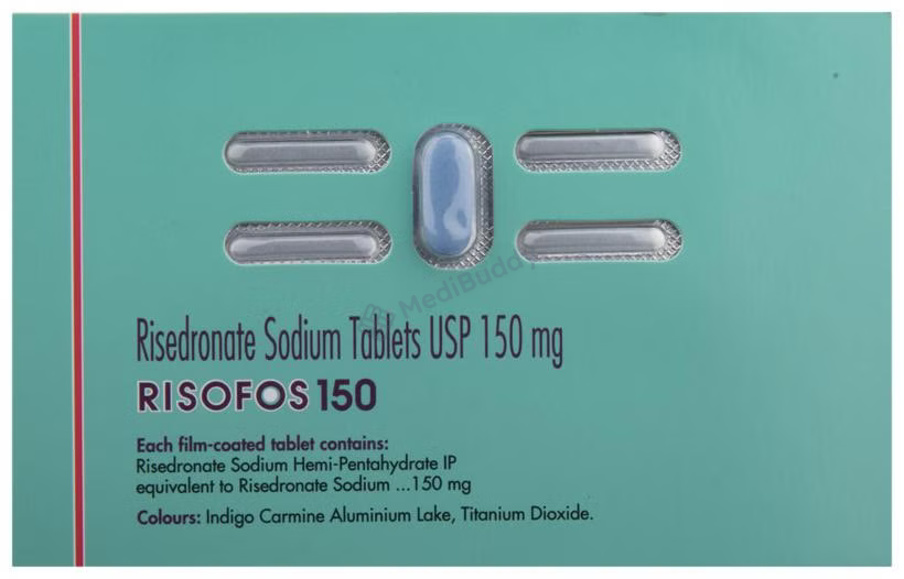 RISOFOS 150MG TABLET is a medication belonging to the bisphosphonate class used to treat or prevent osteoporosis, which is characterized by weakened and brittle bones, typically occurring in postmenopausal women or individuals using steroids for prolonged periods. It is also effective in managing Paget’s disease of the bone. Osteoporosis is a bone condition where bone density is reduced, leading to weaker bones that are more prone to fractures. The active ingredient in RISOFOS 150MG TABLET is Risedronic acid, which works by binding tightly to the bone and preventing the removal of calcium by bone cells called osteoclasts, thus maintaining bone strength and reducing the risk of fractures.