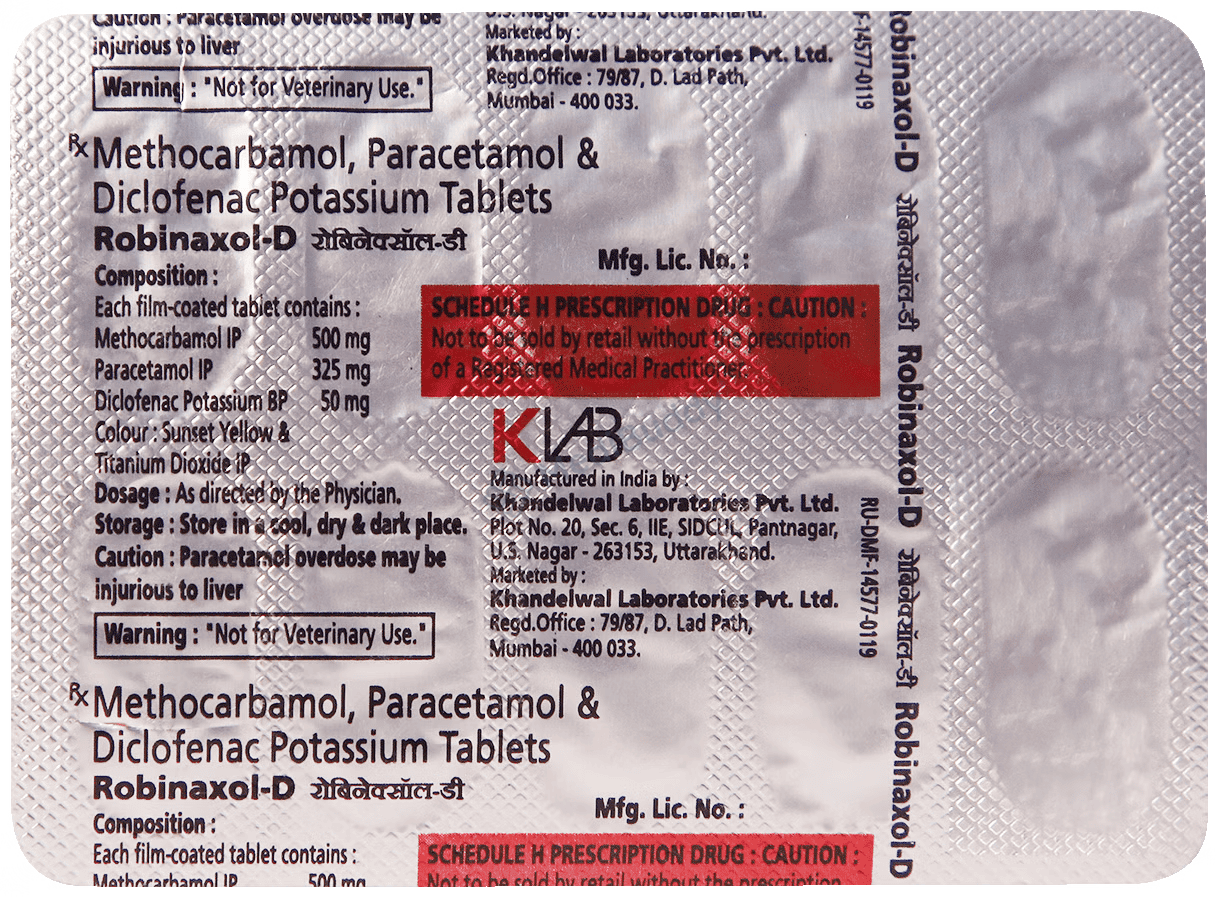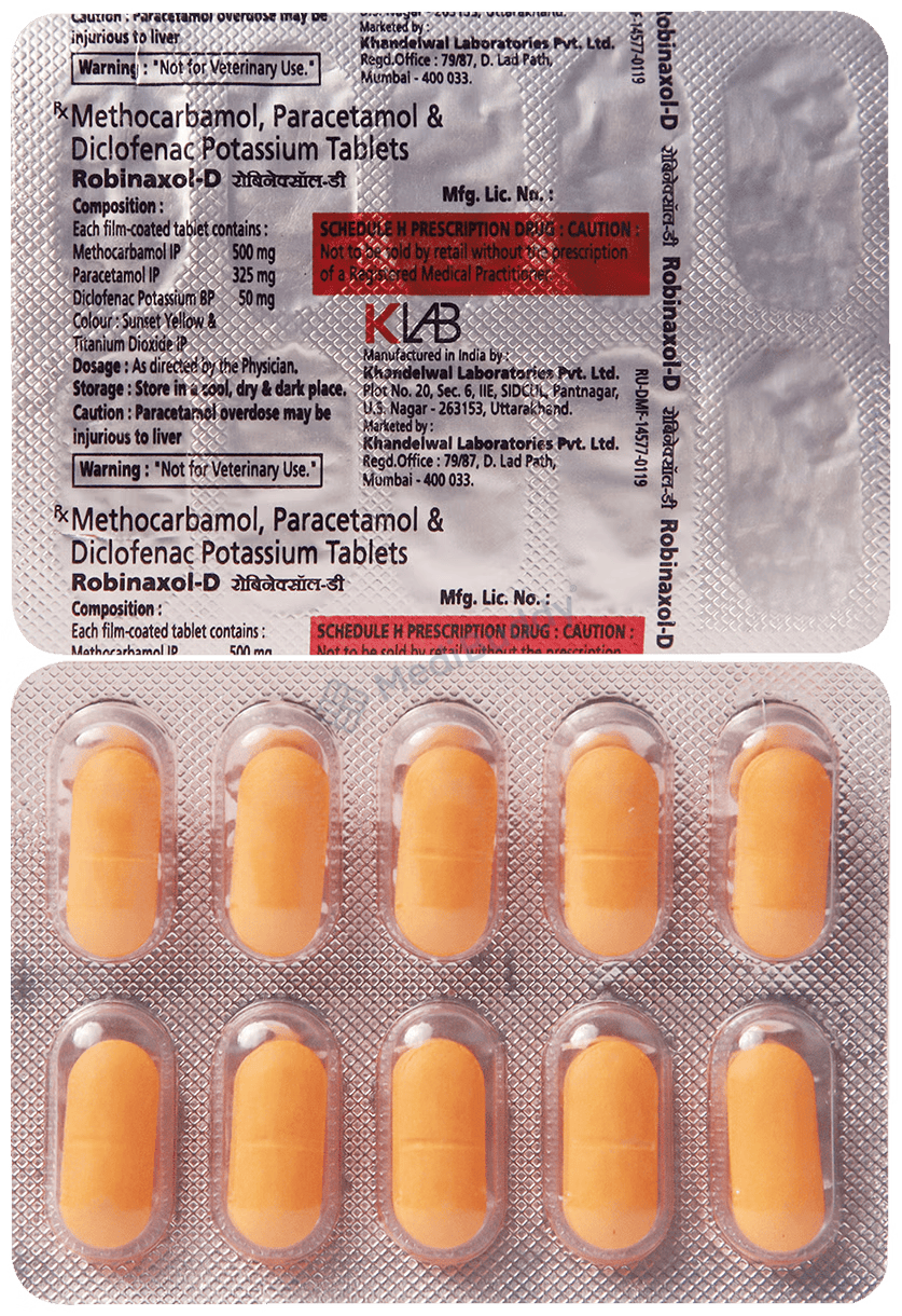 Robinaxol D 50 mg/325 mg/500 mg Tablet is a powerful combination medication designed to alleviate muscular pain. This medication operates by obstructing the release of specific chemical substances that trigger pain, inflammation, and fever. By doing so, it helps enhance muscle movement and alleviate discomfort associated with pain.