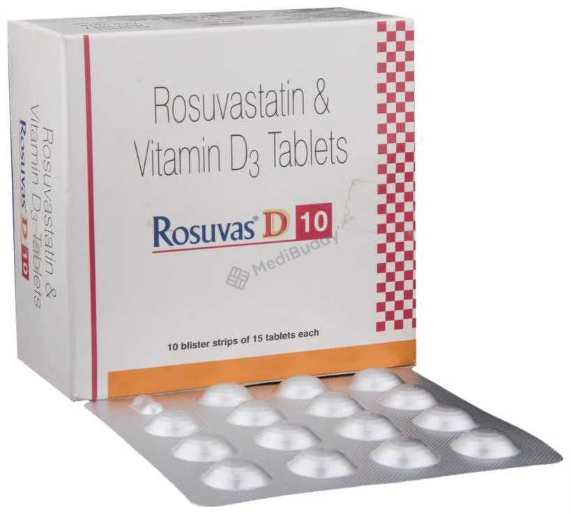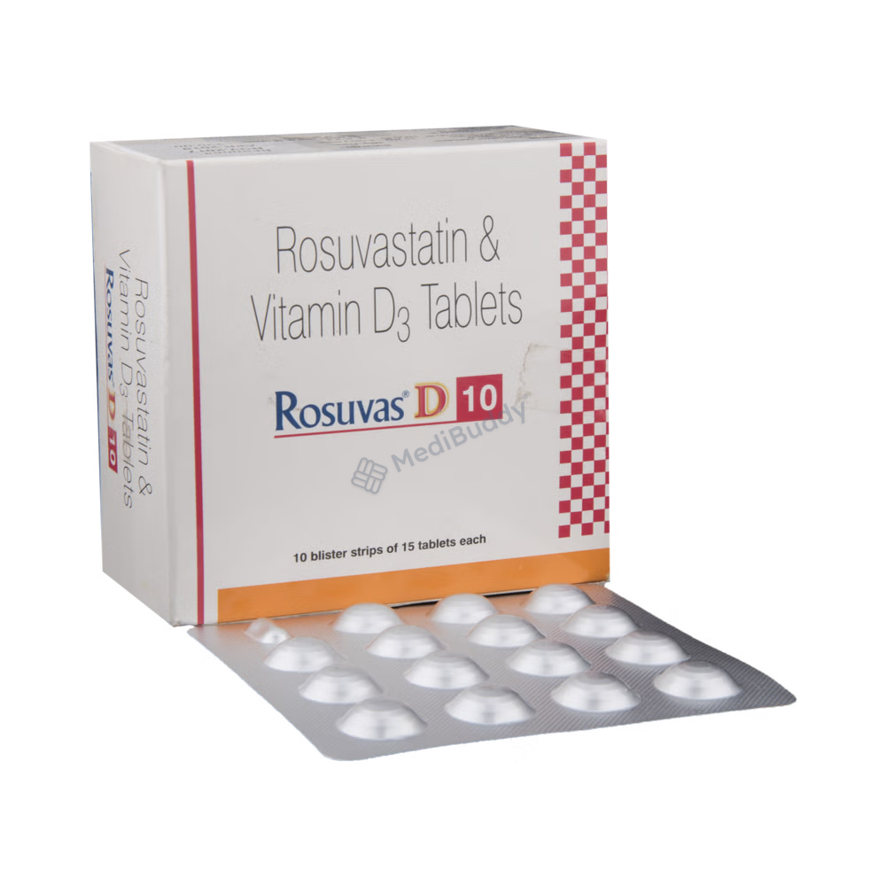 Rosuvas D 10 Tablet is a medication used to treat high cholesterol levels in the body. High cholesterol, also known as hyperlipidaemia or dyslipidaemia, can lead to health issues like heart attacks and strokes. When there is excess bad cholesterol (LDL) in the body, it can result in narrowed and clogged arteries, increasing the risk of heart diseases. Rosuvas D 10 Tablet works by lowering the levels of "bad" cholesterol (LDL) and triglycerides in the body, thus reducing the risk of future heart attacks and strokes.