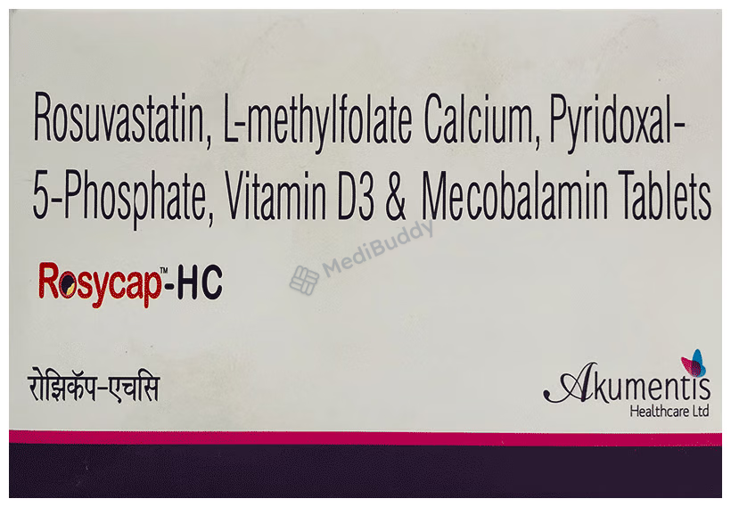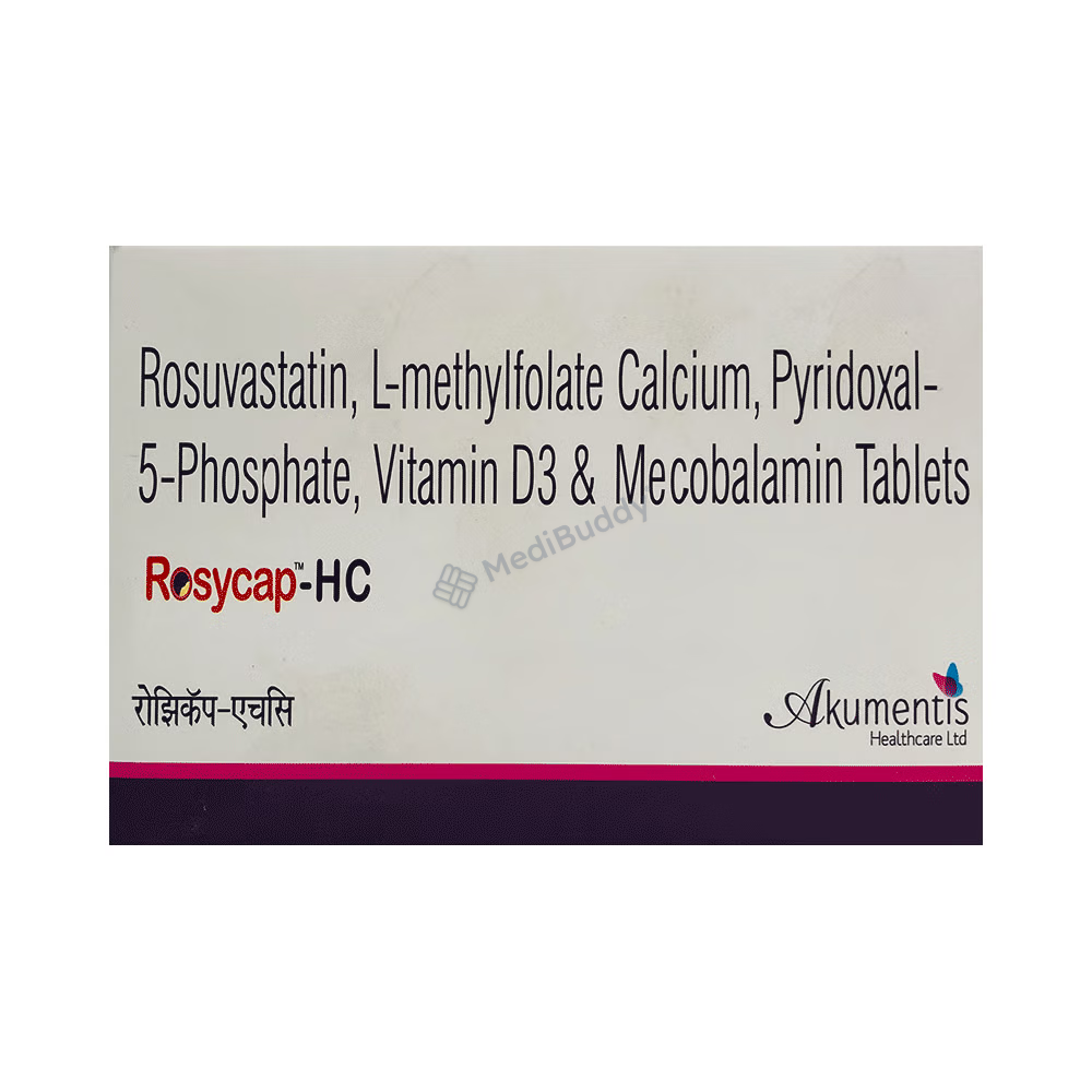 Rosycap HC Tablet is composed of L Methylfolate, Methylcobalamin, Pyridoxal 5 Phosphate, Rosuvastatin, and Vitamin D3, targeting dyslipidaemia. This condition arises from lipid imbalances in the blood, potentially leading to symptoms like chest tightness, dizziness, and exhaustion. Avoid alcohol consumption while using this medication and steer clear if you have allergies to any of its components. Patients with liver issues, kidney stones, or severe kidney problems should also avoid this medication.