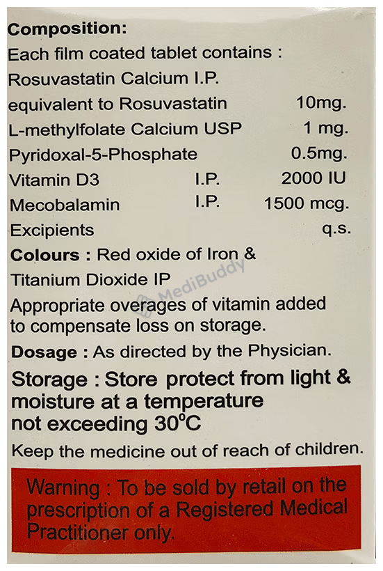 L-Methyl Folate(1mg) + Methylcobalamin/Mecobalamin(1500mcg) + Pyridoxal-5-phasphate(0.5mg) + Rosuvastatin(10mg) + Vitamin D3(2000IU)