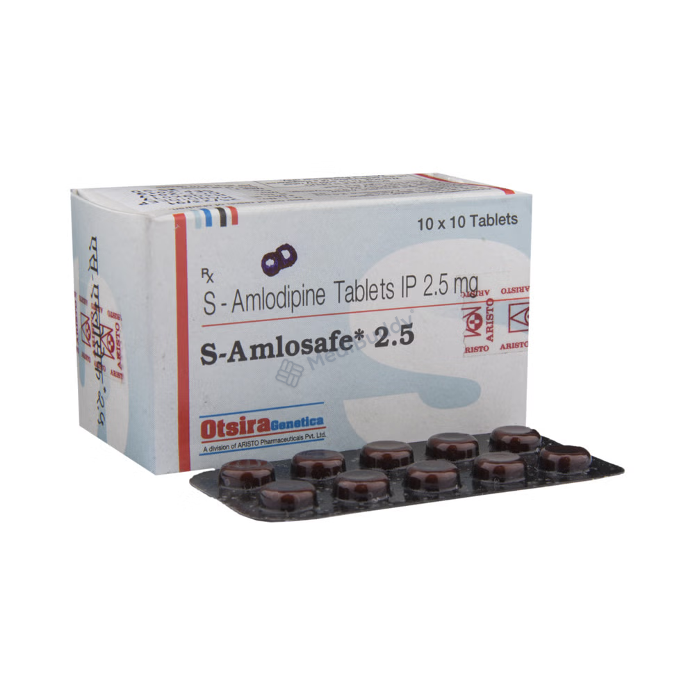 S-Amlosafe 2.5 Tablet is used to treat high blood pressure (hypertension) and prevent angina, which is chest pain related to the heart. This medication is a calcium channel blocker that helps lower blood pressure and reduce the stress on the heart, which can prevent heart attacks and strokes. It can be taken alone or with other medications, with the dosage depending on the condition's severity. It is important to take the medicine consistently as prescribed by your doctor, even if you feel well, to ensure it remains effective. Additionally, maintaining a healthy lifestyle through exercise, weight management, and a balanced diet can further help control blood pressure. Be aware of potential side effects such as fatigue, dizziness, or headaches, and consult your doctor if these symptoms persist. Prior to taking S-Amlosafe 2.5 Tablet, inform your doctor about any liver or kidney issues, pregnancy, breastfeeding, or other medications you are currently using. Regular blood pressure monitoring is also recommended to ensure the medication is working optimally.