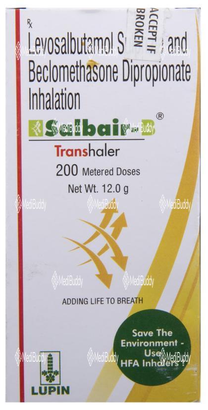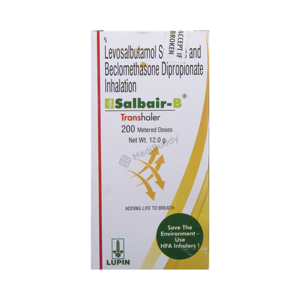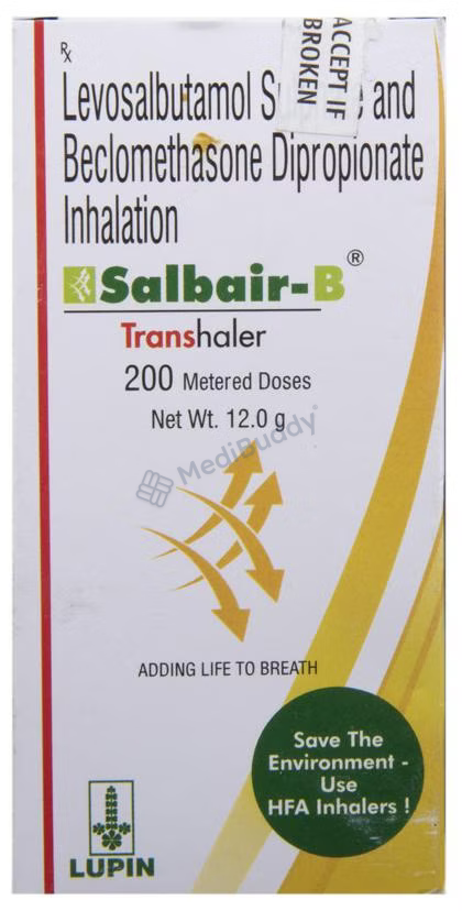 Salbair-B Transhaler is a combination medication used in the treatment of asthma and chronic obstructive pulmonary disease (COPD). It helps in relieving symptoms such as wheezing, shortness of breath, coughing, and chest tightness caused by the narrowing of the airways. This medication contains Beclomethasone, a corticosteroid, and Levosalbutamol, a bronchodilator. Beclomethasone works by preventing the release of certain chemicals in the body that cause inflammation, while Levosalbutamol relaxes muscles and widens the airways in the lungs, making breathing easier.