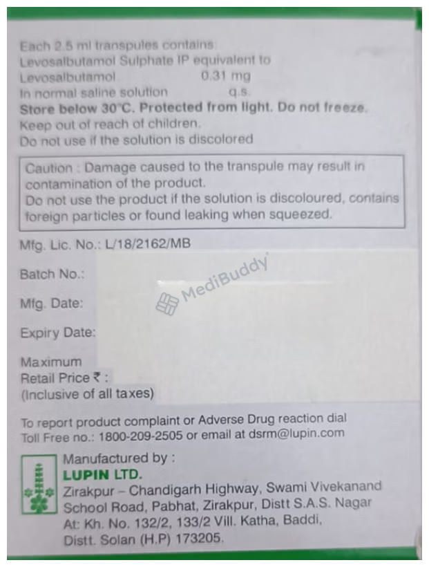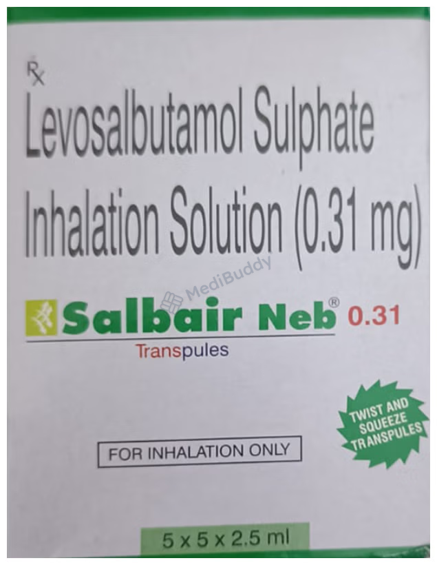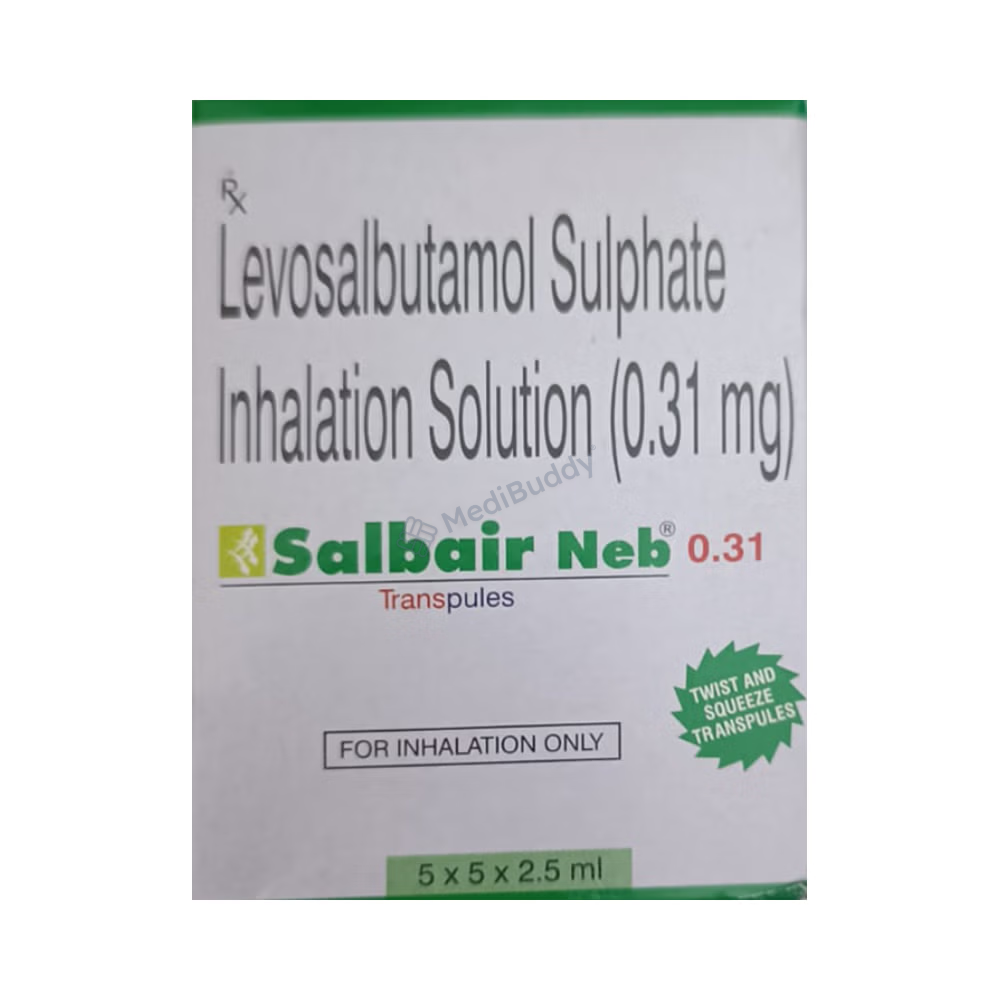 Salbair Neb 0.31 Transpules is a medication classified as a fast-acting bronchodilator or reliever, intended to alleviate symptoms associated with asthma and chronic obstructive pulmonary disease (COPD) such as coughing, wheezing, and shortness of breath. This medication provides rapid relief from breathing difficulties and is typically accompanied by a preventer inhaler to manage symptoms effectively. The effects of Salbair Neb 0.31 Transpules are swift and can last for several hours after administration. It is crucial to take this medication only when symptoms arise, including coughing, wheezing, shortness of breath, and chest tightness, or before engaging in strenuous activities that may lead to breathlessness.