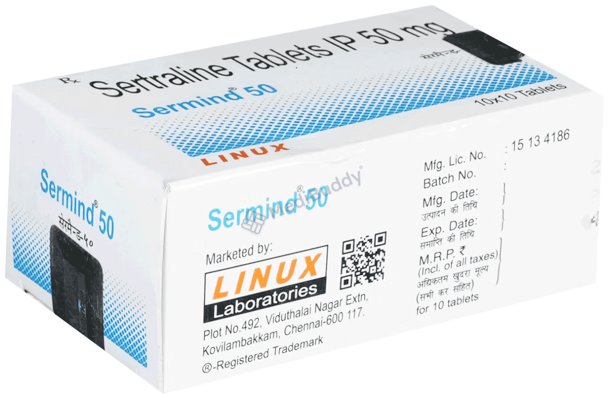 Sermind 50 Tablet is prescribed for depression, anxiety-related conditions like obsessive-compulsive disorder, panic disorder, and premenstrual dysphoric disorder (PMDD). It helps improve mood, relieve anxiety and tension, enhance sleep, and increase energy levels. Patients should take the medication regularly as prescribed by their doctor to get the most benefit. Starting with a lower dose and gradually increasing it is common. Avoid changing the dose or stopping abruptly without consulting your doctor to prevent worsening of symptoms or withdrawal effects. Common side effects may include nausea, indigestion, loss of appetite, increased sweating, tremors, insomnia, and diarrhea. Sexual side effects like decreased libido, delayed ejaculation, or erectile dysfunction may also occur. If any sudden worsening of mood or thoughts of self-harm develop, seek immediate medical attention. Discuss any existing epilepsy, diabetes, liver or kidney disease, heart conditions, or glaucoma with your doctor before starting treatment. Pregnant or breastfeeding women should consult a healthcare professional before using Sermind 50 Tablet.