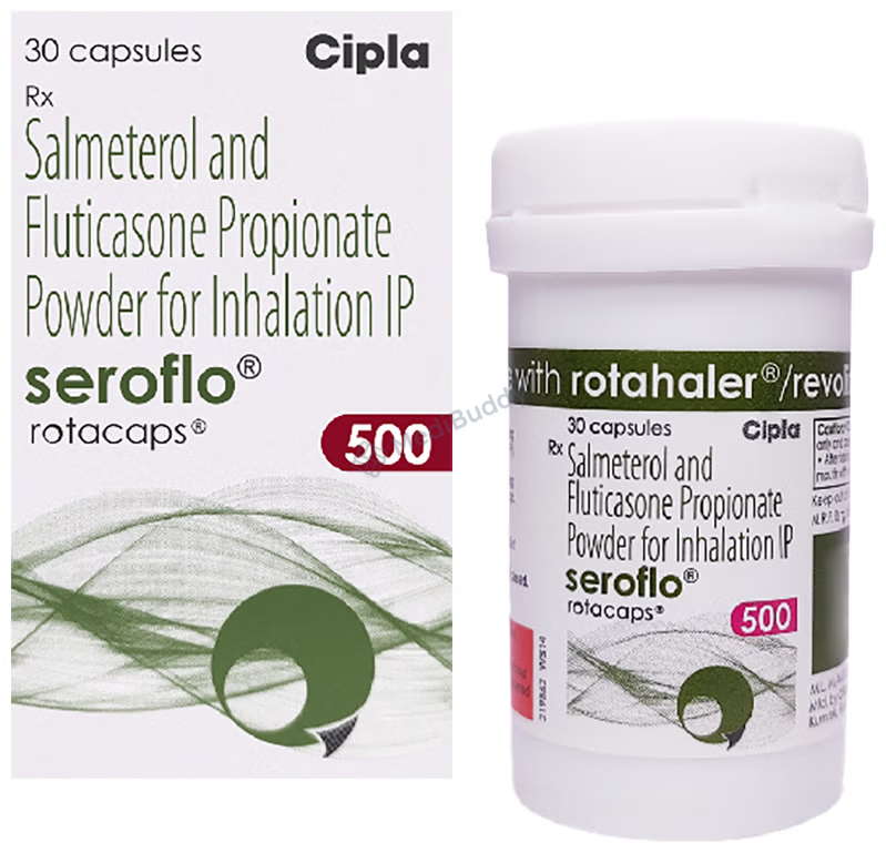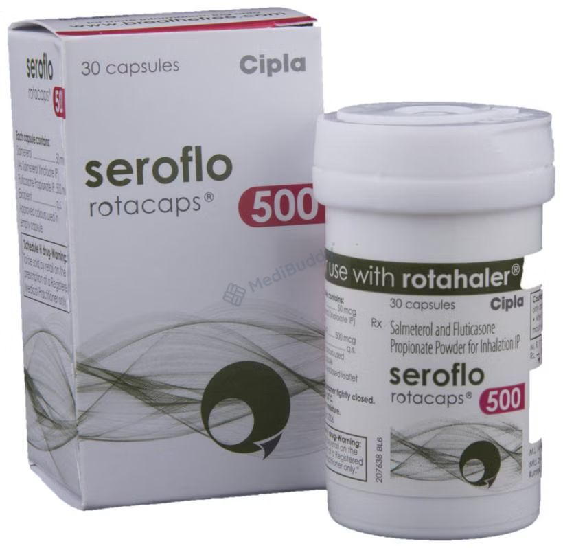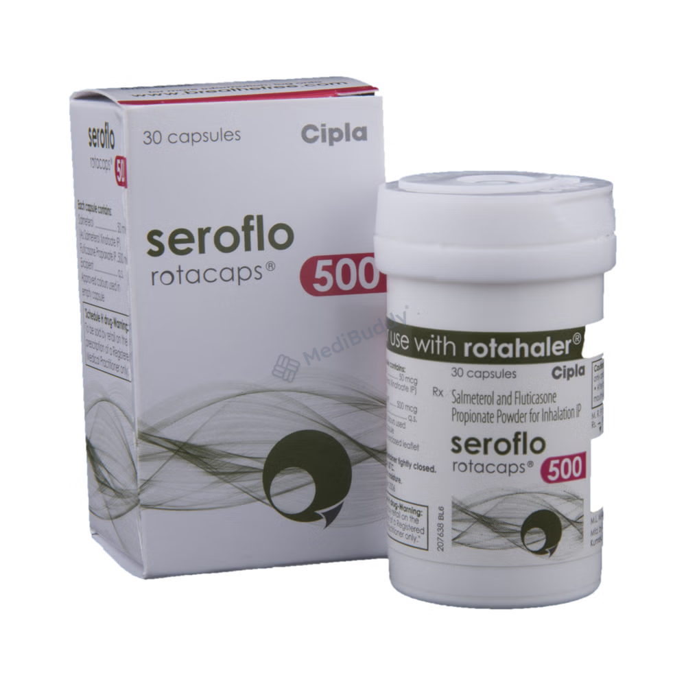 Seroflo 500 Rotacap is a medication designed to help individuals dealing with respiratory issues like asthma and chronic obstructive pulmonary disease (COPD). Asthma is a condition where the airways become inflamed, swell, and produce extra mucus, leading to breathing difficulties, while COPD encompasses chronic bronchitis and emphysema, both causing breathing-related problems. Seroflo 500 Rotacap is formulated using a combination of two components: Salmeterol, which acts as a bronchodilator, and Fluticasone, a corticosteroid.