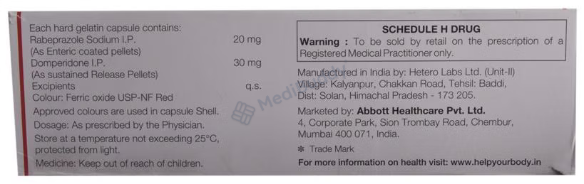 The medication consists of Domperidone and Rabeprazole, which fall into the categories of Dopamine Antagonists and Proton pump inhibitors, respectively. It is prescribed for patients who have not responded adequately to Rabeprazole alone for their GERD. Additionally, Setgi Capsule SR can also be utilized to treat peptic ulcers, which are painful sores that can develop in the stomach, esophagus, or intestines due to factors like H. pylori infection or NSAIDs use. Symptoms of peptic ulcers may include stomach pain, flatulence, indigestion, vomiting, and fatigue.