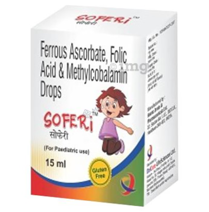 Soferi Drops is a specialized vitamin supplement tailored to address anemia in children, containing key ingredients such as ferrous ascorbate equivalent to elemental iron, folic acid IP, and methylcobalamin IP. These components play vital roles in enhancing red blood cell production, increasing hemoglobin levels, and promoting effective oxygen transportation within the body.