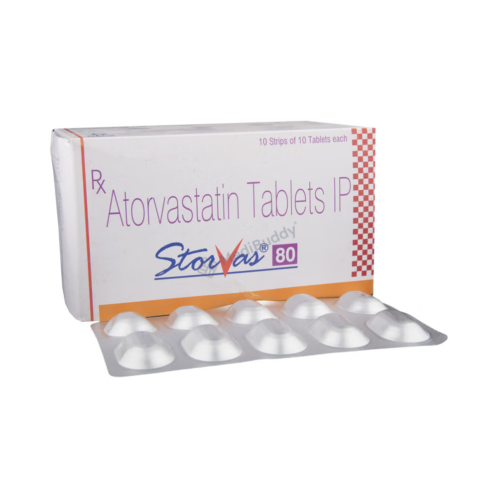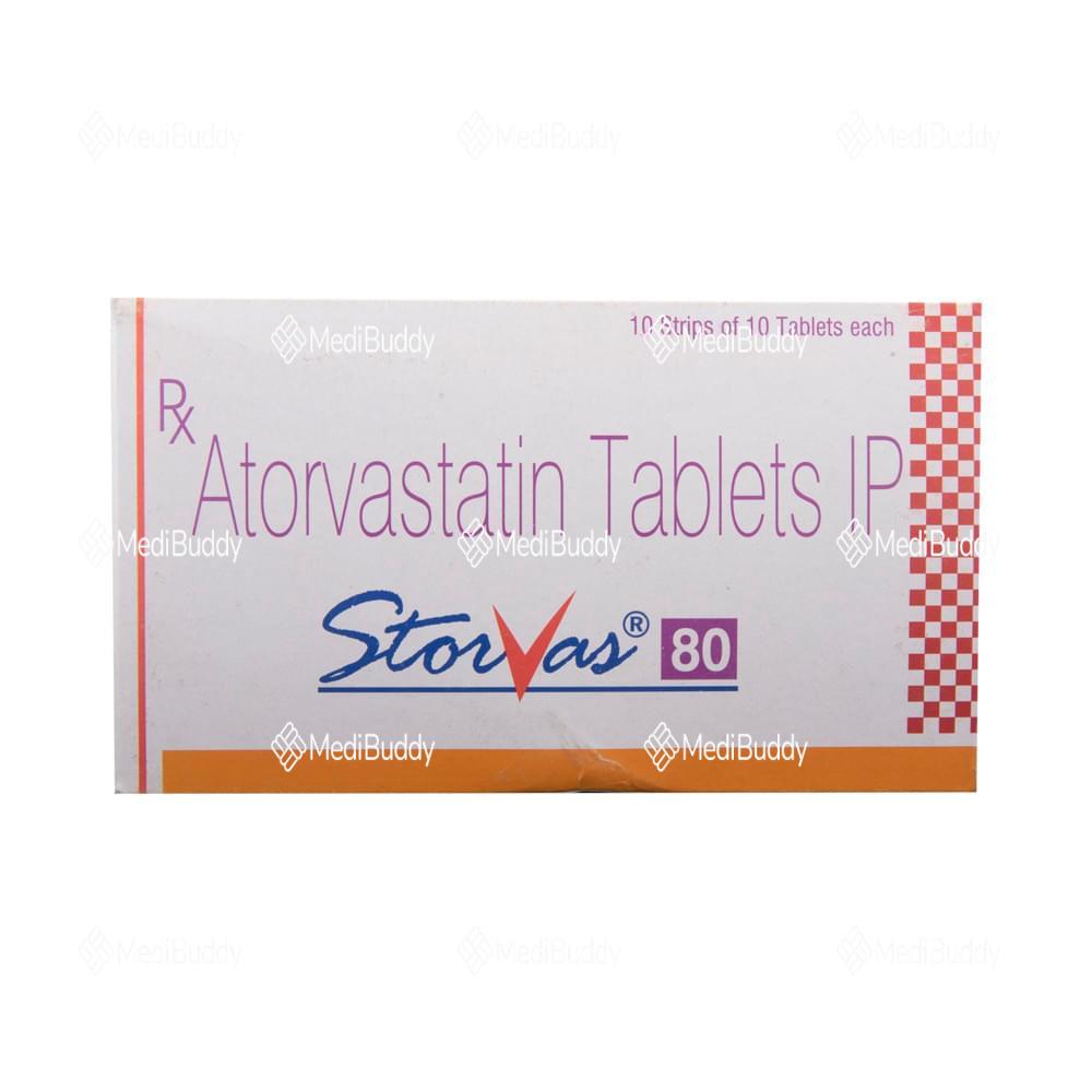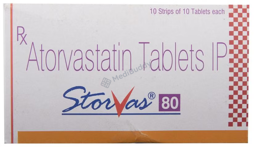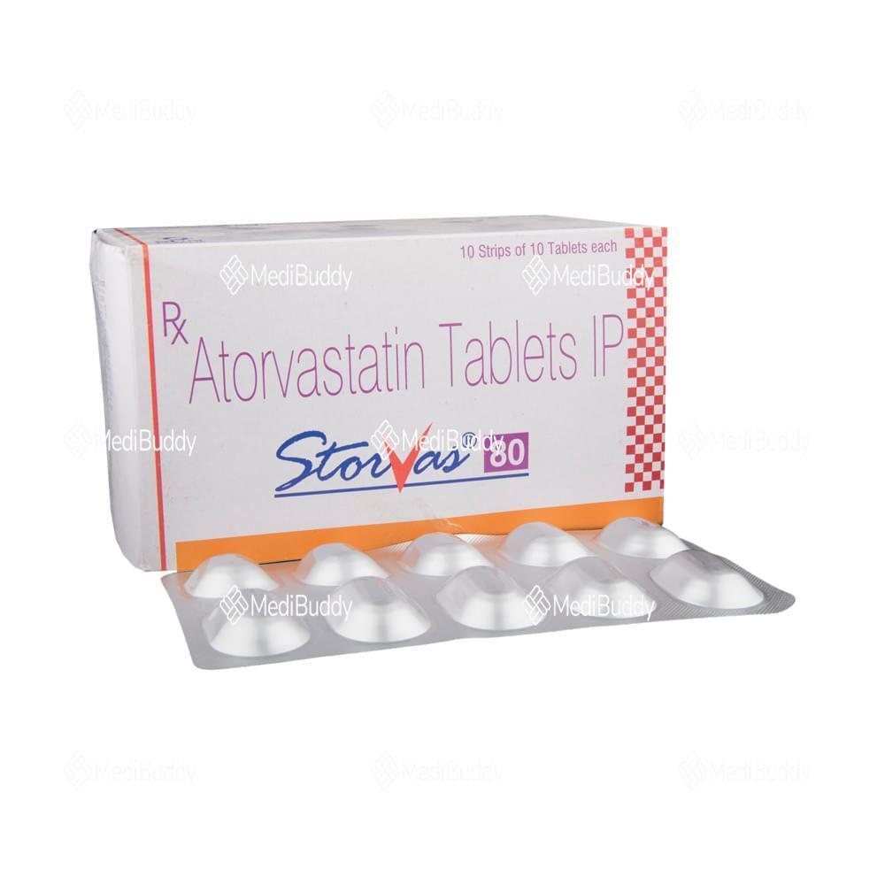 Storvas 80 Tablet is a medication classified as a statin and is primarily used to lower cholesterol levels in the body. Cholesterol is a fatty substance that can accumulate in the blood vessels, leading to narrowing which may cause serious conditions like heart attacks or strokes. Storvas 80 Tablet, containing Atorvastatin, specifically targets reducing low-density lipoprotein (LDL) or "bad" cholesterol while increasing high-density lipoprotein (HDL) or "good" cholesterol levels.