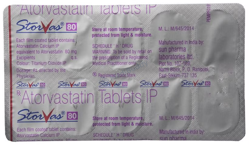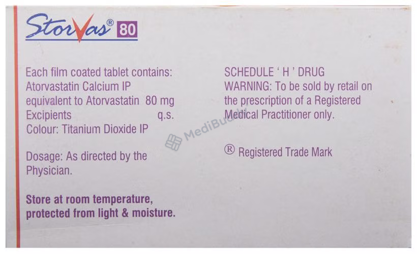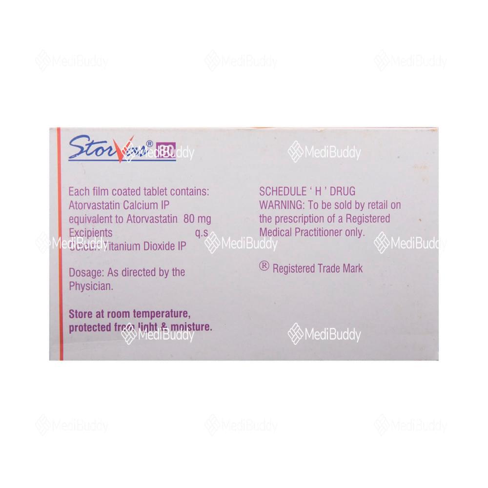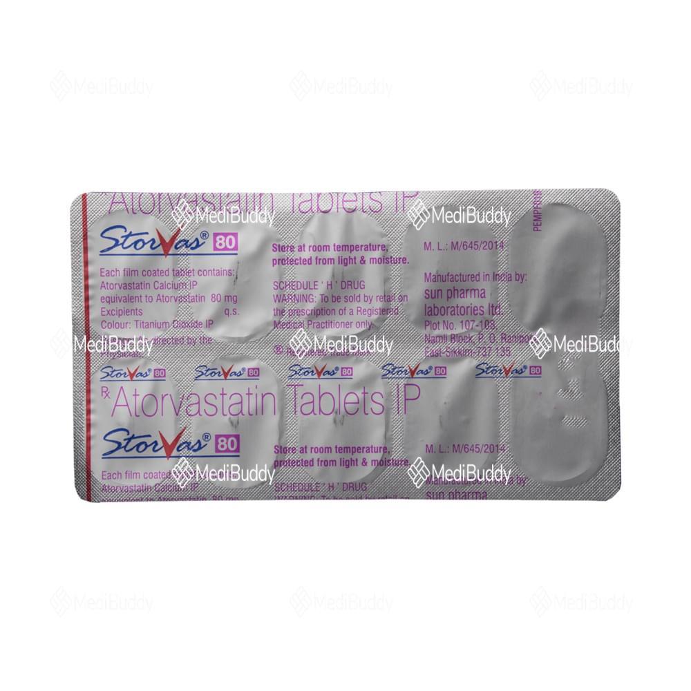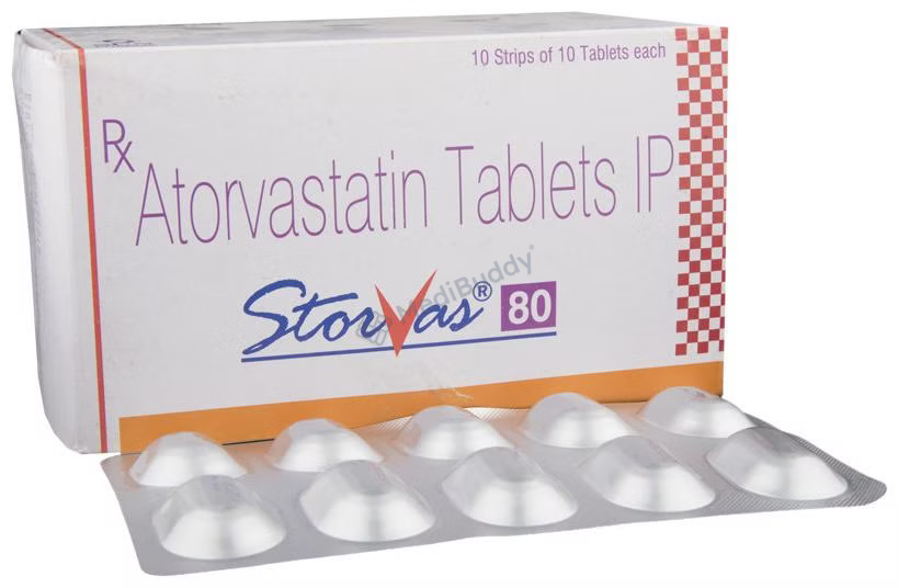 Storvas 80 Tablet is a medication classified as a statin and is primarily used to lower cholesterol levels in the body. Cholesterol is a fatty substance that can accumulate in the blood vessels, leading to narrowing which may cause serious conditions like heart attacks or strokes. Storvas 80 Tablet, containing Atorvastatin, specifically targets reducing low-density lipoprotein (LDL) or "bad" cholesterol while increasing high-density lipoprotein (HDL) or "good" cholesterol levels.