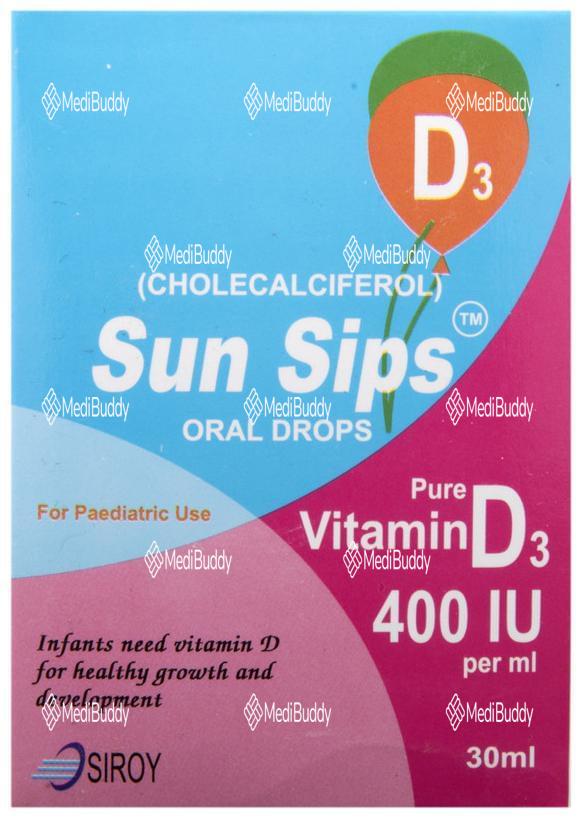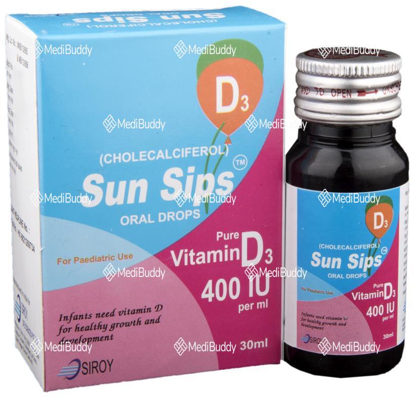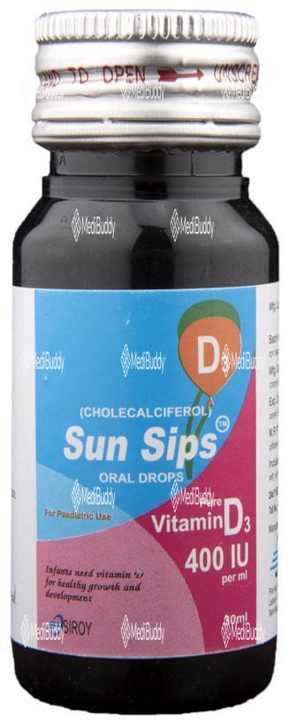 Sun Sips 400IU Drop is a supplement containing cholecalciferol at a strength of 400 International Units (I.U.). Cholecalciferol is a form of Vitamin D3, known for its role in treating deficiencies of Vitamin D3, particularly in children and breastfeeding mothers who may not get enough sunlight exposure.