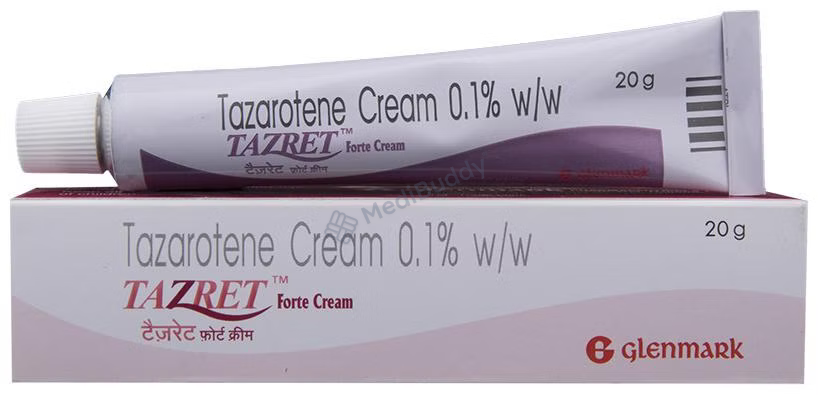 Tazret Forte Cream, containing Tazarotene, belongs to a group of medicines called Retinoids. It is specifically designed for managing plaque psoriasis and acne vulgaris, two common skin conditions. Plaque psoriasis presents as dry, itchy, raised patches of skin covered with scales, while acne vulgaris causes inflammation of sebaceous follicles on the face and upper body.