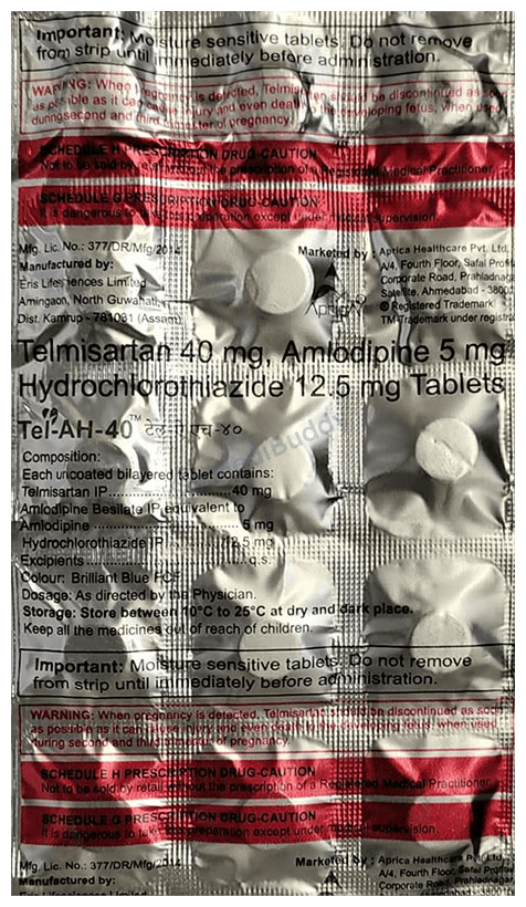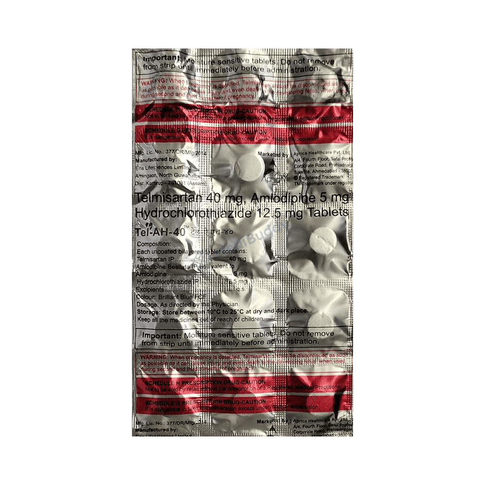 Tel AH 40 Tablet is a medication used to treat hypertension, also known as high blood pressure. High blood pressure is a condition where the force of blood against the artery walls is elevated, leading to potential heart issues and other complications. Tel AH 40 Tablet contains a combination of three active ingredients: Telmisartan, Amlodipine, and Hydrochlorothiazide. Telmisartan works by blocking substances that constrict blood vessels, allowing for smoother blood flow and improved heart efficiency. Amlodipine, a calcium channel blocker, relaxes and widens blood vessels. Hydrochlorothiazide is a diuretic that helps eliminate excess water and electrolytes from the body through urine. This combination medication aims to lower high blood pressure, reducing the risk of future heart attacks and strokes.