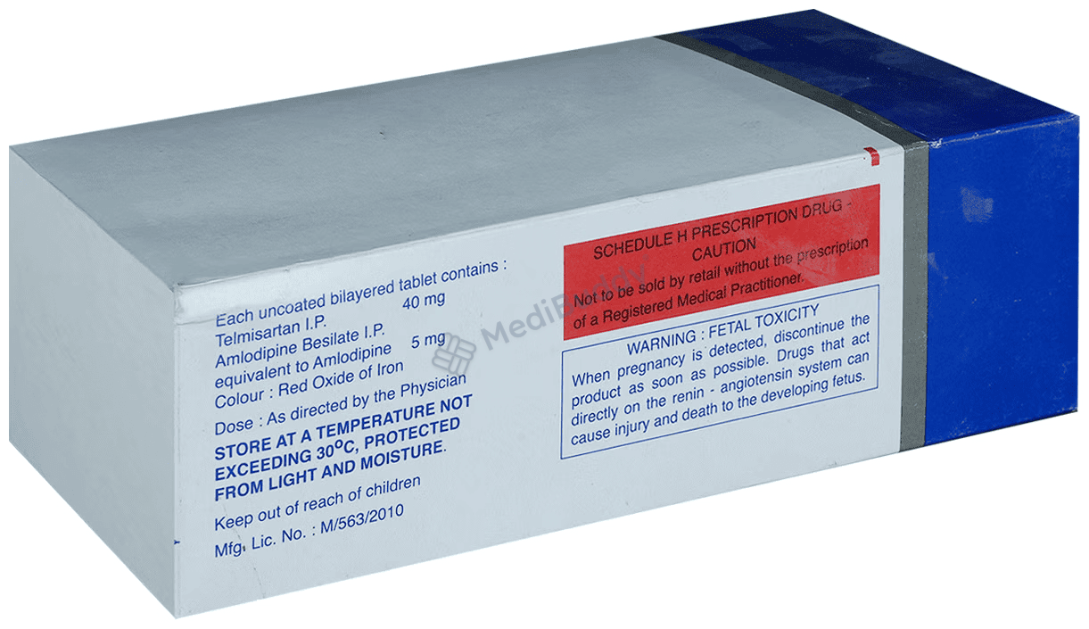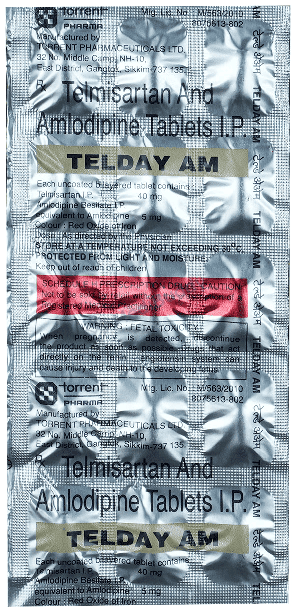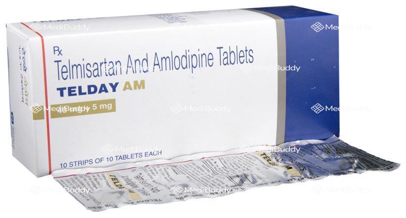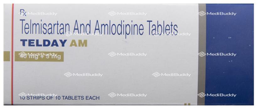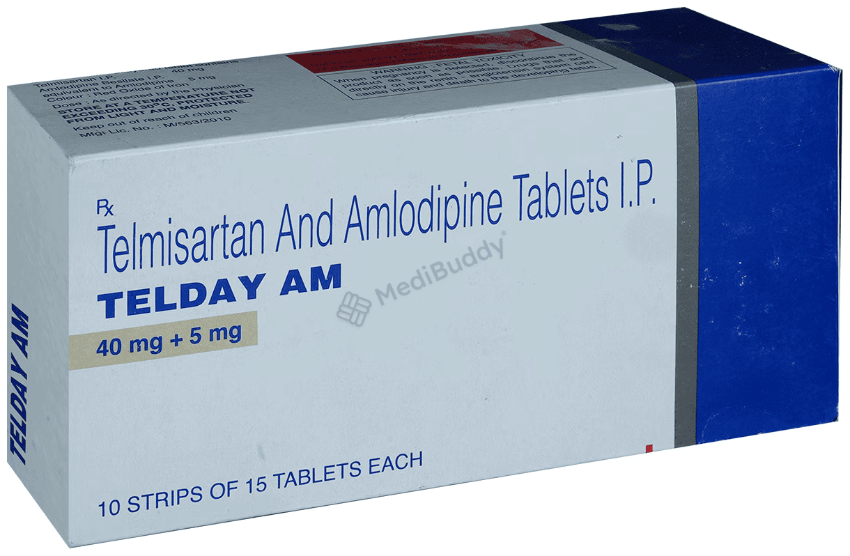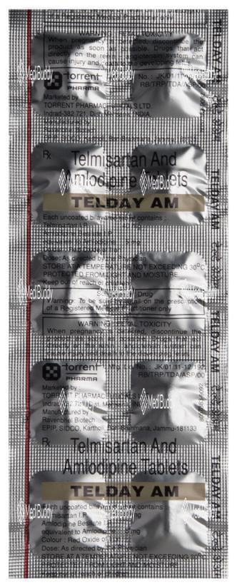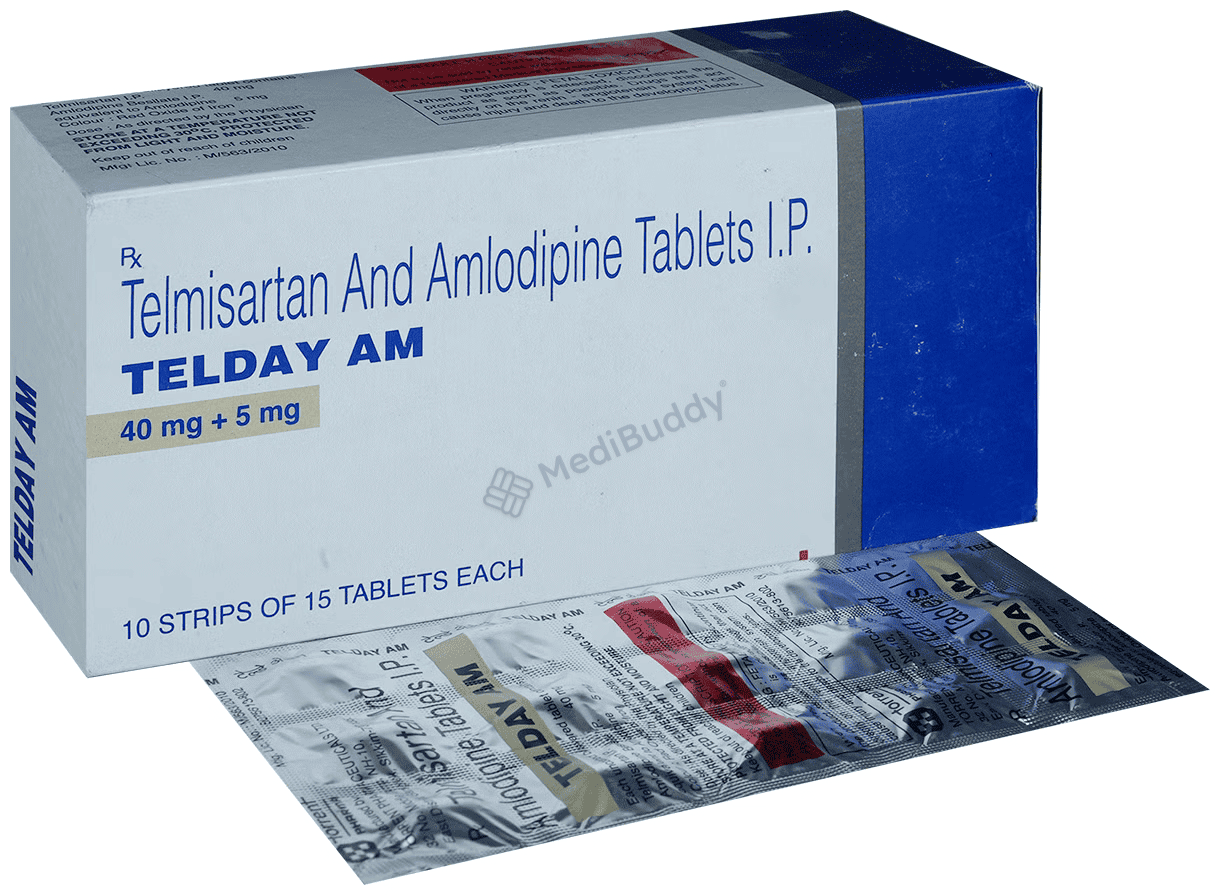 Telday AM Tablet is used to treat high blood pressure. The two medicines in this tablet help relax blood vessels, making it easier for the heart to pump blood, thereby reducing the risk of heart attacks or strokes. It is important to take this medicine regularly at the same time each day as prescribed by your doctor. Even if you feel well, continue taking it to lower the risk of heart issues. Making lifestyle changes like staying active and following a low-salt, low-fat diet can enhance the medication's effectiveness. Common side effects may include swelling in ankles or feet, headache, dizziness, and upset stomach. Consult your doctor for persistent side effects. Prior consultation is necessary for individuals with kidney or liver issues, severe dehydration, pregnant, or breastfeeding. Regular monitoring of blood pressure and kidney function is required while taking this medicine.