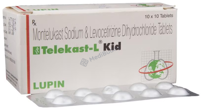 Telekast-L Kid is a combination of Levocetirizine and Montelukast, categorized as H1 and leukotriene receptor antagonists. It serves to treat and prevent allergic rhinitis, chronic idiopathic urticaria, and bronchial asthma in adults and adolescents aged 15 years and above. Allergic rhinitis, or hay fever, comes with nasal inflammation, congestion, sneezing, and itchy eyes due to allergens like pollens or dust. Bronchial asthma involves airway inflammation and symptoms like coughing and chest tightness.