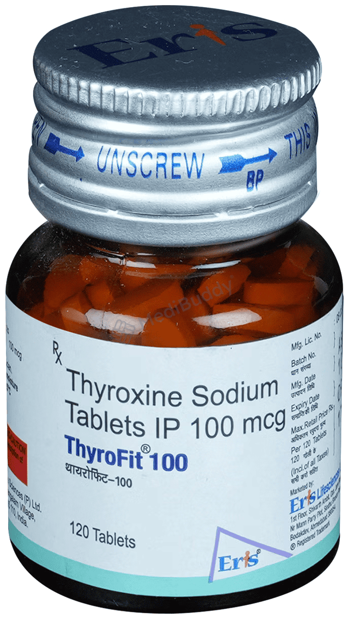 Thyrofit 100 Tablet is a medication used to treat hypothyroidism, a condition where the thyroid gland does not produce enough thyroid hormone. This synthetic thyroid hormone, thyroxine, helps replace the missing hormone and regulate the body's metabolism and energy levels. It is crucial to have regular blood tests to determine the appropriate dosage for your body. Taking Thyrofit 100 Tablet on an empty stomach before your first meal helps in better absorption, and it is recommended to take it regularly for maximum benefits. It may take some time for the symptoms to improve, and discontinuing the medication could lead to a return of symptoms.