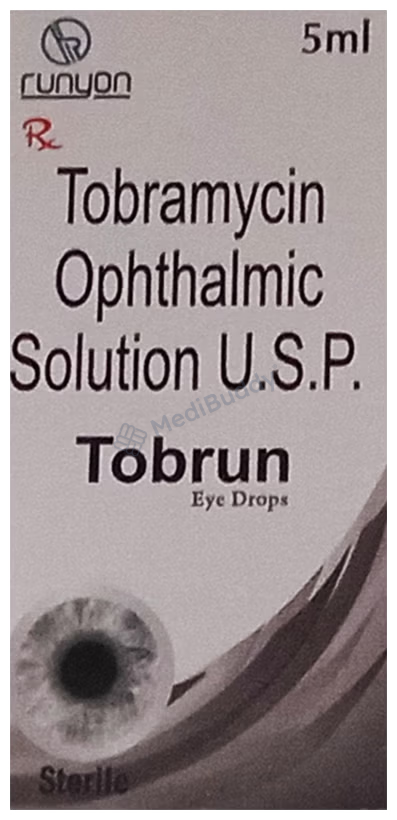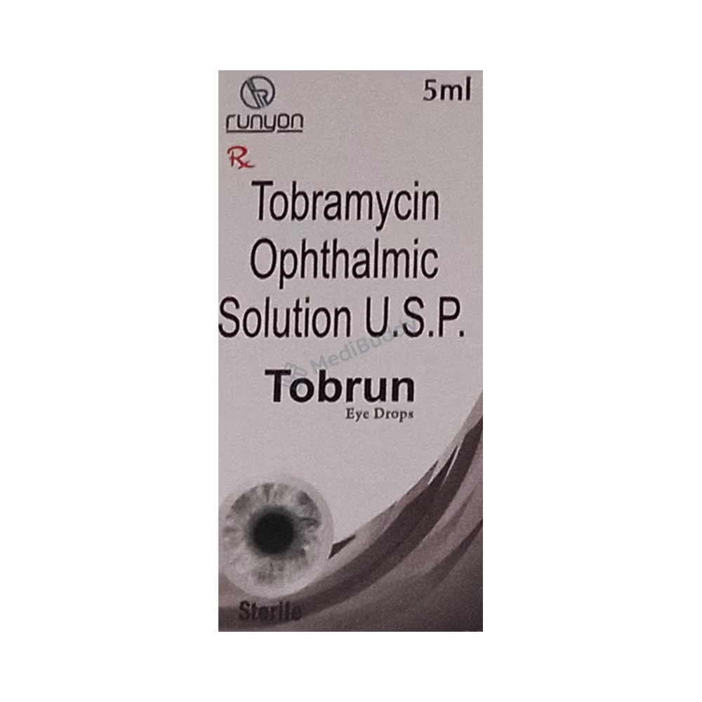Tobrun Eye Drop is a beneficial medication specifically designed to treat bacterial eye infections. As an antibiotic medicine, Tobrun Eye Drop works by effectively halting the growth of the bacteria responsible for the infection. By targeting the root cause of the issue, Tobrun Eye Drop helps to alleviate common symptoms such as pain, redness, itching, and soreness associated with eye infections. It is essential to follow your doctor's guidance regarding the dosage and treatment duration for optimal results. Completing the full course of treatment is crucial as it ensures the complete eradication of the infection, reducing the likelihood of it recurring in the future. Utilizing Tobrun Eye Drop as prescribed by your healthcare provider can effectively manage and treat bacterial eye infections, providing relief and promoting overall eye health.