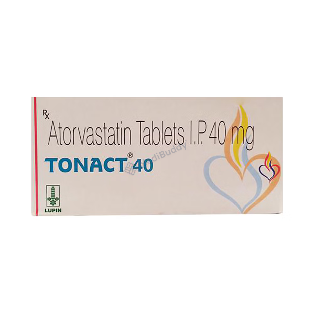 Tonact 40 Tablet is a medication classified as a statin, designed to decrease cholesterol levels in the body and lessen the risk of heart diseases associated with elevated cholesterol. Cholesterol, a fatty substance that accumulates in blood vessels, can result in narrowing and potentially lead to severe conditions like heart attacks or strokes. Widely prescribed, Tonact 40 Tablet is considered safe for extended use as per the doctor's guidance. It can be consumed with or without food, ideally at the same time daily. Despite individuals with high cholesterol often not experiencing symptoms, discontinuing the medication can elevate cholesterol levels, heightening the risk of heart issues.