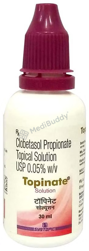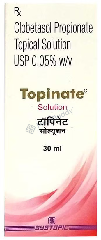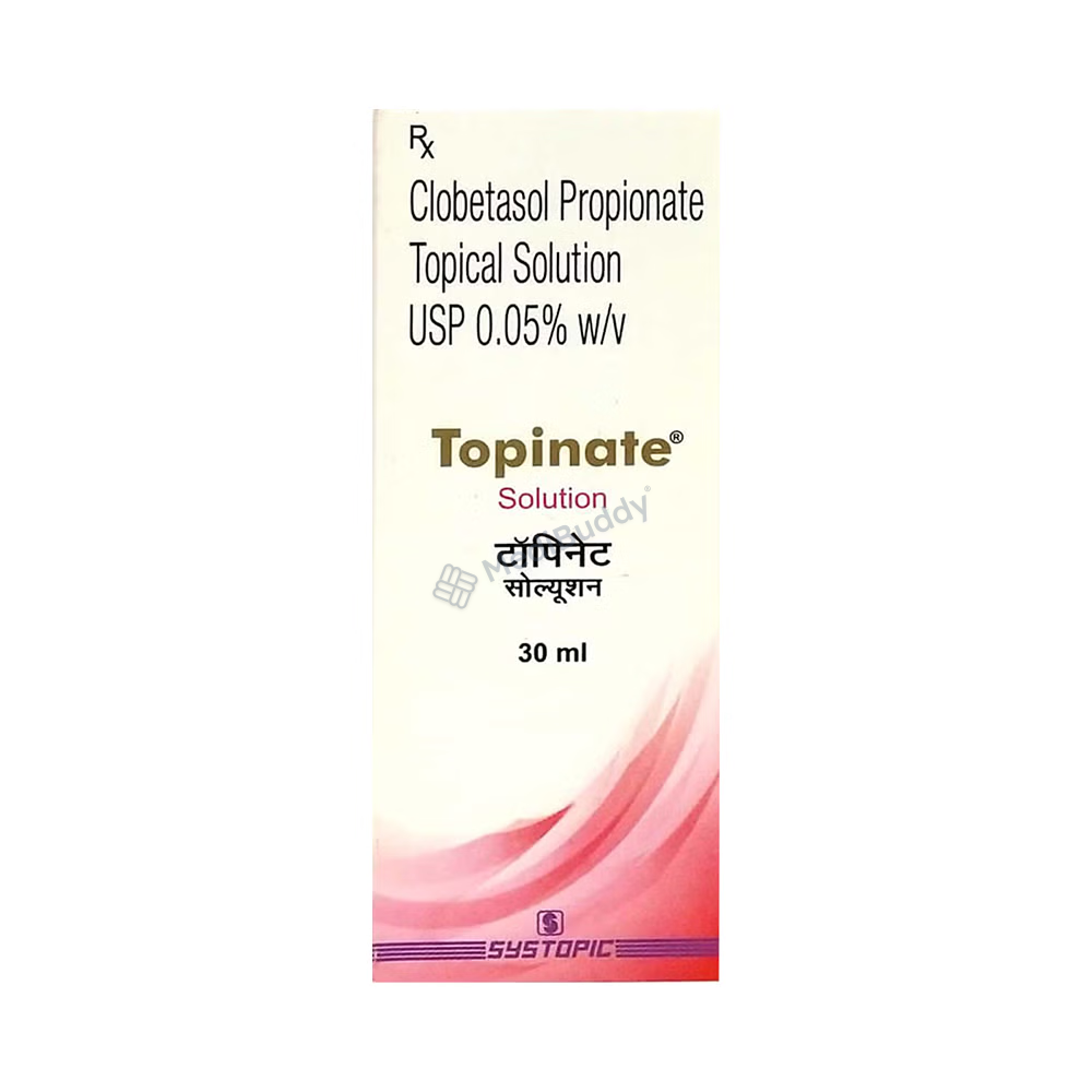 Before using Topinate 0.05%W/V Topical Solution 30Ml, inform your doctor if you have had an allergic reaction to another steroid. In case of an overdose, clean the affected area thoroughly and re-apply the medicine. Be cautious when applying the medication near the eyes or on the eyelids to avoid the risk of cataracts or glaucoma if the solution enters the eye frequently. The solution can easily penetrate the skin, potentially causing skin thinning with repeated use. Take care when using it on broken or damaged skin or on a large surface area of skin. If you notice vision problems or any unusual symptoms, contact your doctor immediately. Do not use other creams or ointments such as moisturizers simultaneously with Topinate 0.05%W/V Topical Solution 30Ml; allow at least 30 minutes between applying clobetasol and any other product.