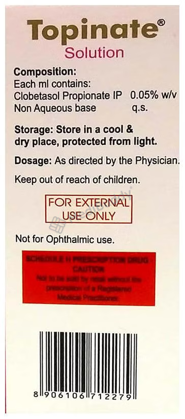It is crucial to use the prescribed amount of Topinate 0.05%W/V Topical Solution 30Ml as directed by your healthcare provider for optimal results. Consistent use of this solution can maximize its benefits. Some individuals may experience a temporary burning or stinging sensation upon initial application, which typically diminishes after a few days of use. If there is any known allergy to Clobetasol or other ingredients in the solution, it should be communicated to the doctor. Specific skin conditions like acne, rosacea, perioral dermatitis, anogenital pruritis, and widespread plaque psoriasis (except for single lesions) are not suitable for treatment with Topinate 0.05%W/V Topical Solution 30Ml. Moreover, precaution should be taken to avoid contact with the eyes during application. If accidental eye contact occurs, thorough rinsing with warm water is advised.