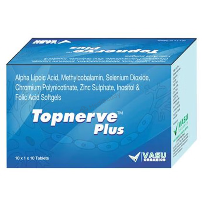 The Topnerve Plus Soft Gelatin Capsule contains a blend of essential ingredients like Methylcobalamin, alpha-Lipoic acid, Selenium Dioxide, Chromium Polynicotinate, Zinc Sulfate, Folic acid, and Inositol. These ingredients work together to provide vital vitamins and minerals, promoting overall health and well-being.