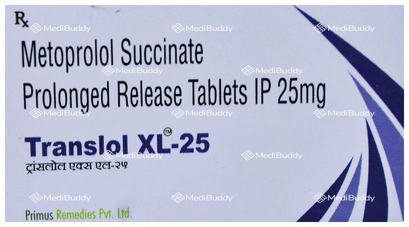 Translol 25mg Tablet XL is a medication classified under beta-blockers, designed to manage various conditions such as high blood pressure, heart-related chest pain known as angina, irregular heart rhythms called arrhythmia, and even to prevent migraines, future heart attacks, and stroke. This tablet can be prescribed alone or in combination with other medications, depending on the individual's needs and the severity of the condition being treated. It is essential to take this medication consistently at the same time daily to maximize its effectiveness. While the full benefits of Translol 25mg Tablet XL may take some weeks to manifest, it is crucial to continue the course as directed by a healthcare professional, even if symptoms improve, as abruptly stopping the treatment can worsen the condition, particularly in individuals with high blood pressure.