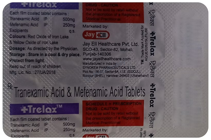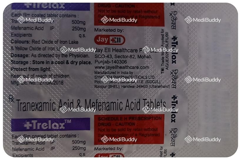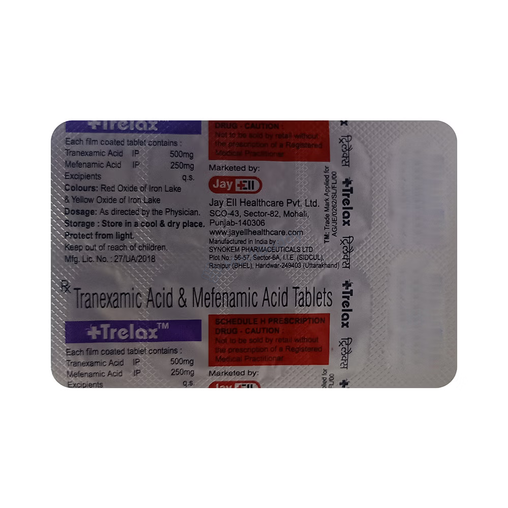 Trelax Tablet 10's is a combination medicine that is specifically designed to address two common concerns among women - dysmenorrhea (period pain) and menorrhagia (heavy menstrual bleeding). Menstrual cramps, also known as dysmenorrhea, can be quite uncomfortable and characterized by specific cramps and pain during menstruation. On the other hand, menorrhagia refers to abnormally heavy or prolonged bleeding during periods. Trelax Tablet 10's combines the effectiveness of Tranexamic acid, an anti-fibrinolytic agent, and Mefenamic acid, a nonsteroidal anti-inflammatory drug (NSAID).