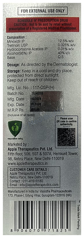 Hydrocortisone(0.01% w/v) + Minoxidil(12.5% w/v) + Tretinoin(0.025% w/v)