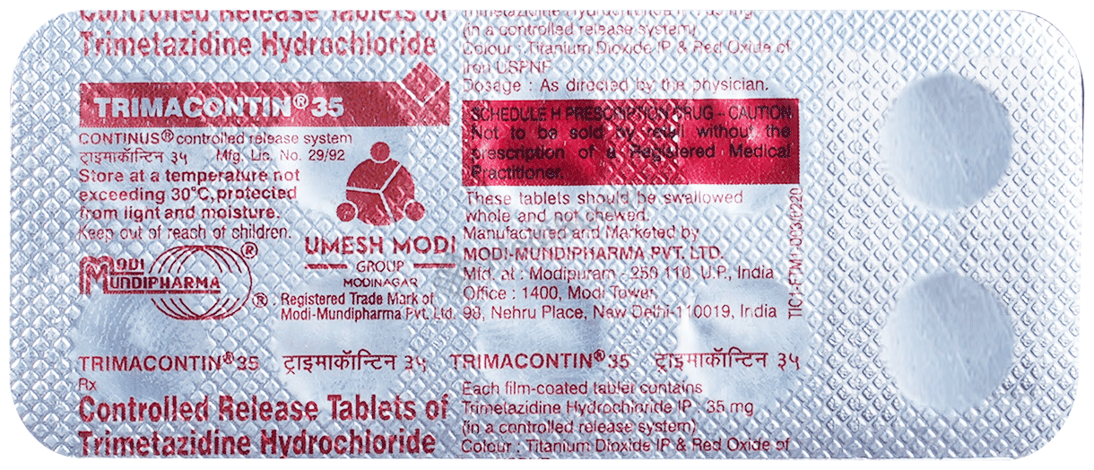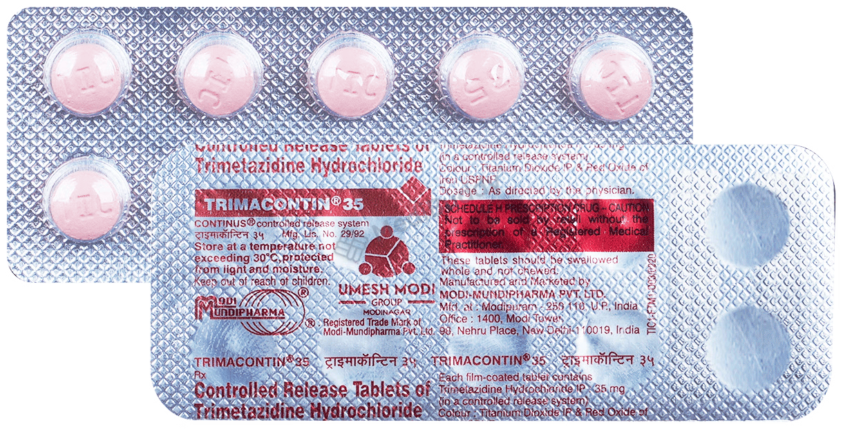 Trimacontin 35 Tablet is used to treat heart-related chest pain known as angina. Angina occurs when the heart does not receive enough oxygen-rich blood due to narrowed blood vessels. By maintaining energy metabolism in cells with reduced oxygen supply, Trimacontin 35 Tablet prevents a drop in energy levels, ensuring proper heart muscle function. It can improve exercise tolerance and daily activities by reducing angina attack frequency. Taking the medication regularly is crucial for effectiveness, with research showing a significant reduction in angina attacks after 6 months of treatment. Remember to follow your doctor's instructions for optimal benefits.