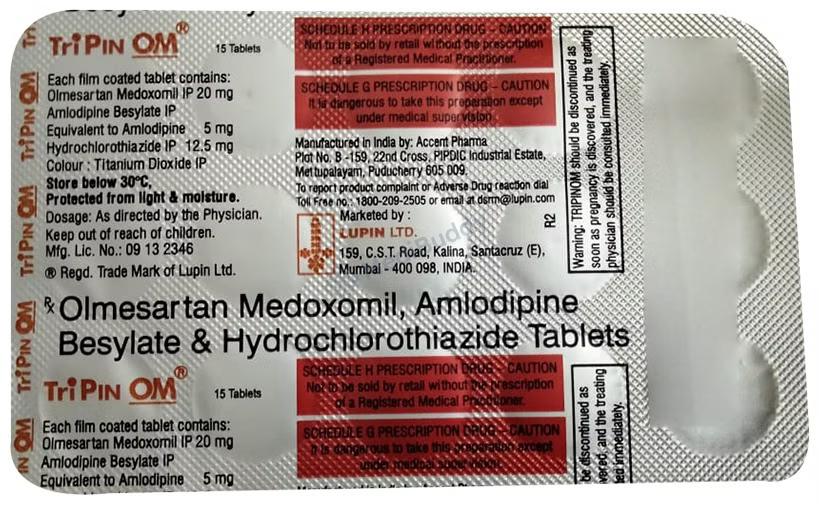 Tripin OM Tablet is a combination medication primarily used to treat hypertension or high blood pressure when a single medication alone is not effective. This tablet plays a crucial role in lowering high blood pressure levels, ultimately reducing the risk of future heart attacks and strokes. It combines three active ingredients: Olmesartan medoxomil, Amlodipine, and Hydrochlorothiazide, each serving a specific purpose in treating hypertension.