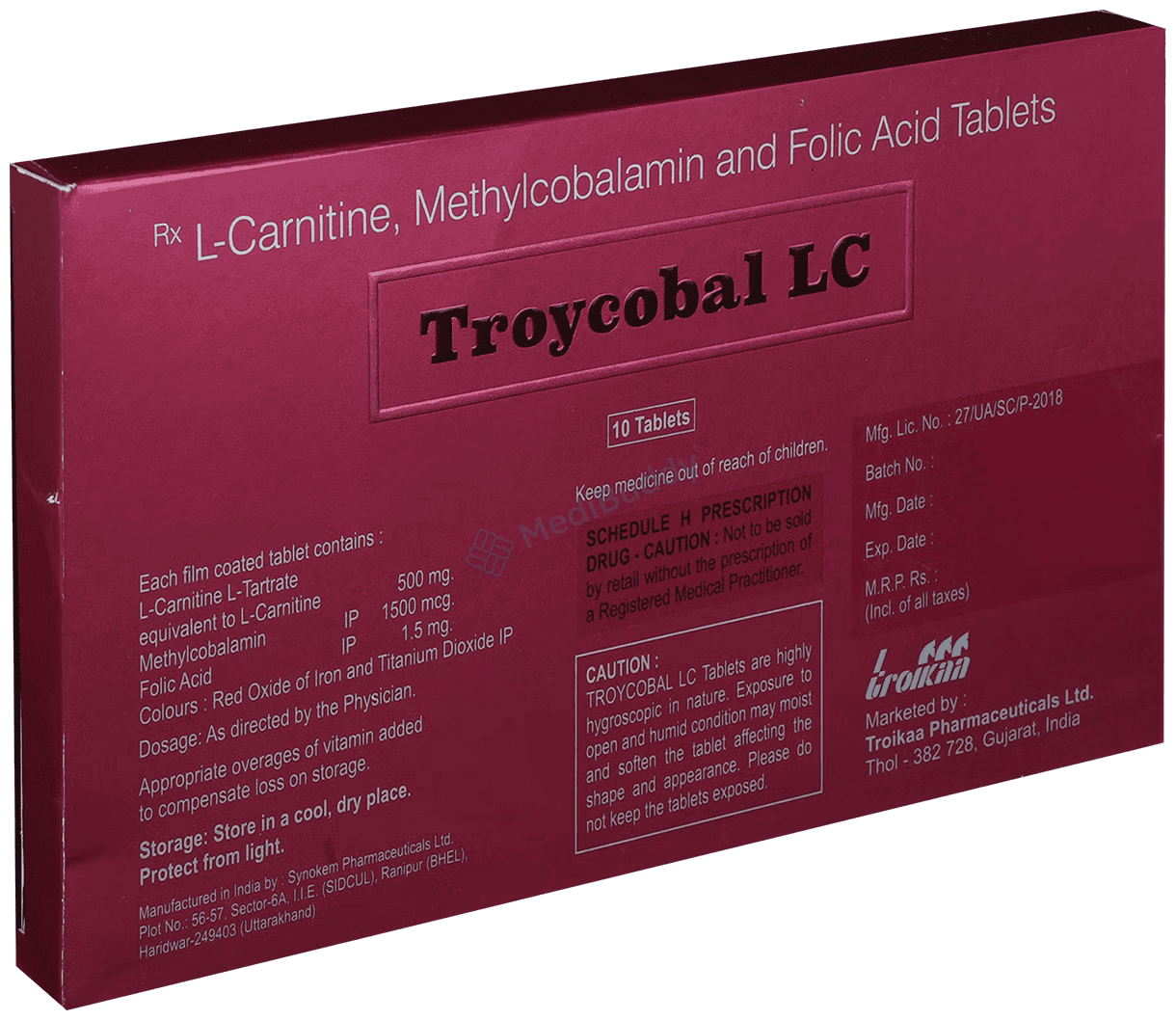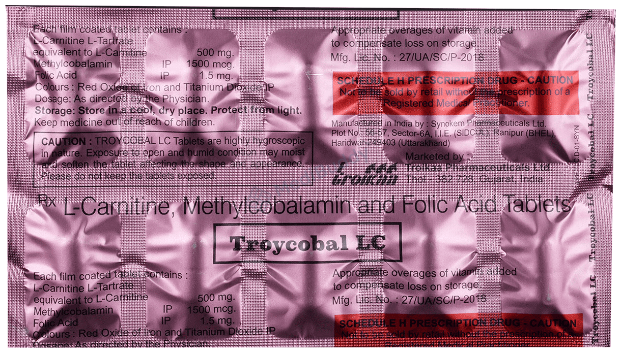 Troycobal LC Tablet contains Folic Acid, L-Carnitine, and Methylcobalamin, falling under the category of Nutritional Supplements. It is utilized in the treatment of various conditions such as primary systemic carnitine deficiencies, cardiomyopathy, skeletal myopathy, coronary heart disease, long-term hemodialysis, oligospermia, and for patients on valproic acid or zidovudine treatment. However, individuals with Leber's disease should avoid using this medication unless directed by a doctor.