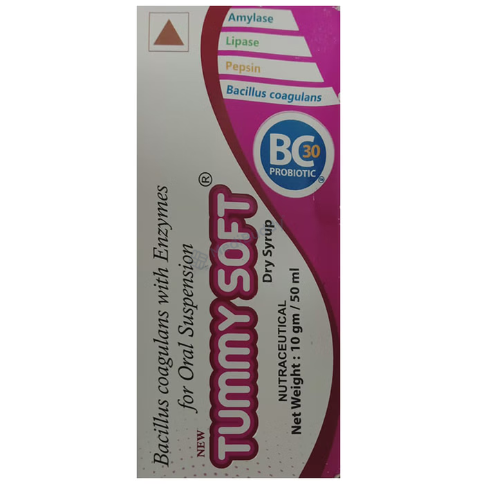 Tummy Soft Dry Syrup is a dietary supplement designed to support digestion and maintain a healthy gut. It contains key ingredients such as bacillus coagulans, alpha amylase, pepsin, and lipase, which work together to restore and maintain normal gut microflora. This can aid in improving the absorption of nutrients from food and may help prevent conditions such as diarrhoea and loss of beneficial bacteria caused by antibiotic use.