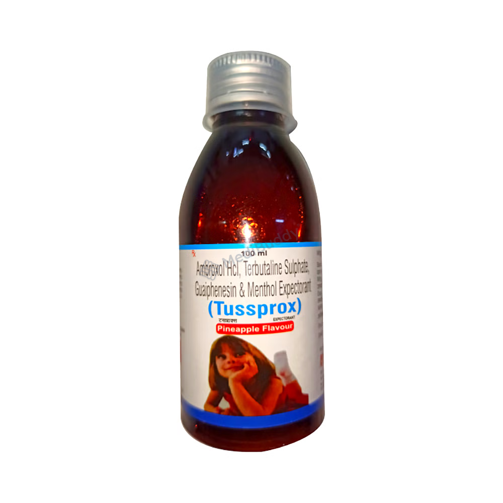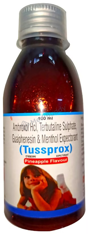TUSSPROX PINEAPPLE FLAVOUR EXPECTORANT contains Ambroxol, Guaiphenesin, Terbutaline, and Menthol that belong to various groups of medicines with specific functions. This medication is effective in treating productive cough linked with conditions like bronchospasm, bronchitis, bronchial asthma, chronic obstructive pulmonary disease, bronchiectasis, and chest congestion. Before commencing treatment, diagnostic tests may be required as per your doctor's recommendation.