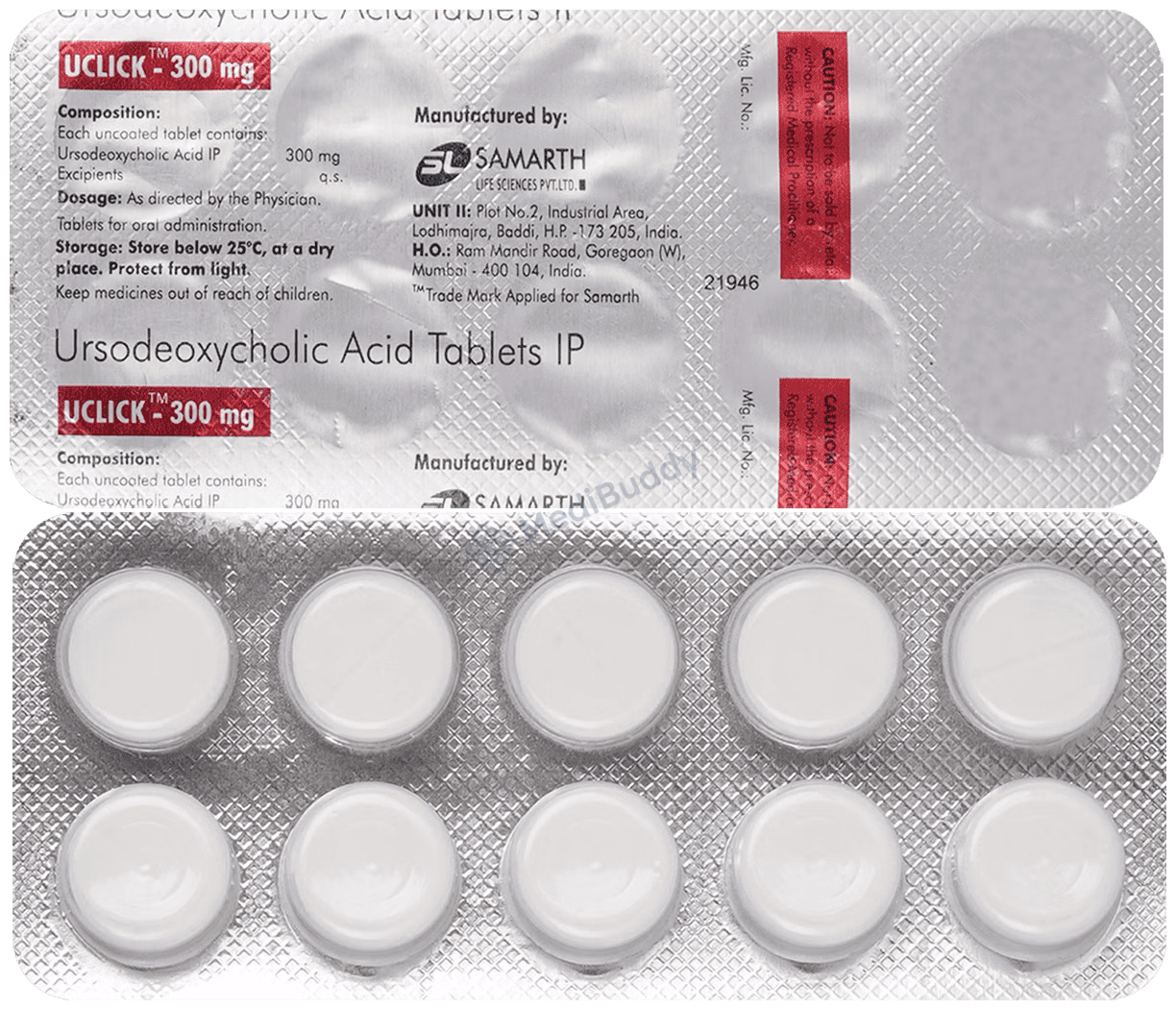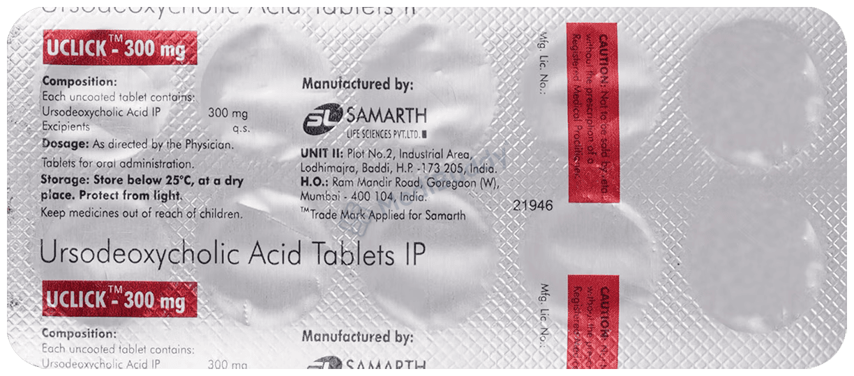 Uclick 300mg Tablet is primarily used for two main conditions - to dissolve certain gallstones and to treat a liver disease known as primary biliary cirrhosis. For gallstones, it works by breaking down cholesterol that has hardened into stones in the gallbladder, helping to dissolve them over time. When used to treat primary biliary cirrhosis, it can prevent or delay liver damage, especially if started early. This condition is a liver disease that worsens gradually and can lead to liver failure if left untreated. Taking Uclick 300mg Tablet regularly as prescribed is important for both conditions.