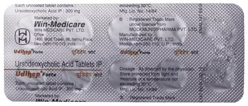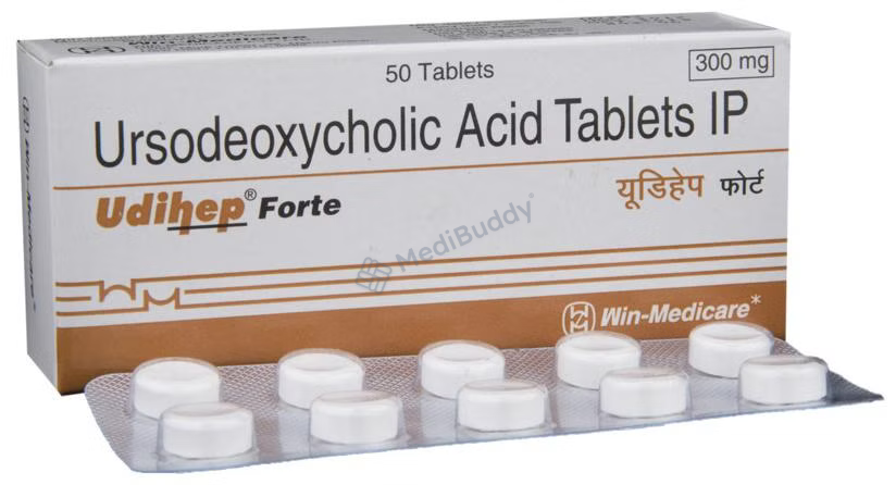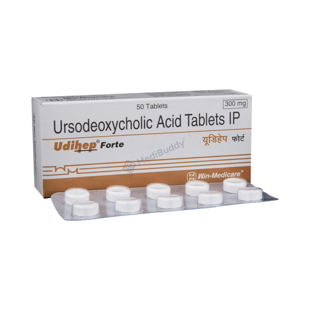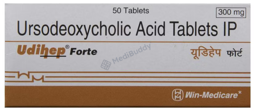 Udihep Forte Tablet is a medication used for various conditions related to the liver and gallbladder. It is primarily used to dissolve certain gallstones and prevent their formation. Additionally, it is prescribed for treating primary biliary cirrhosis, a type of liver disease. The tablet functions by breaking down cholesterol that has formed into stones in the gallbladder, aiding in the dissolution of these stones.