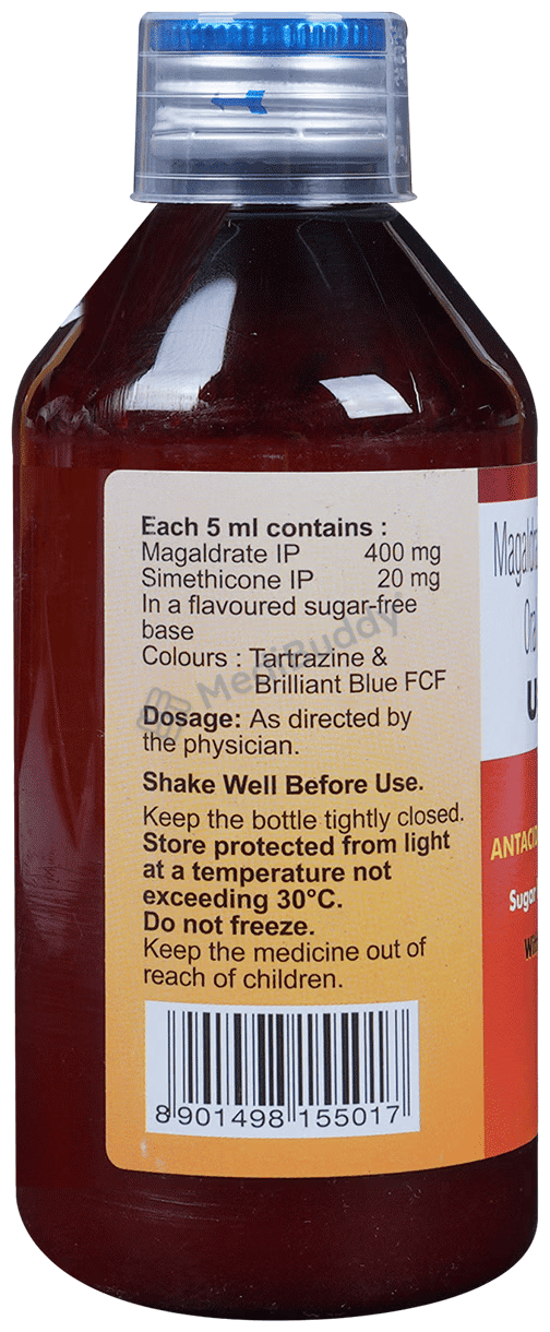 Ulgel Oral Suspension Saunf Sugar Free is used to treat acidity, stomach ulcers, and bloating by reducing excessive acid in the stomach and aiding gas passage. For acidity, it relieves heartburn and indigestion, while for stomach ulcers, it reduces stomach acid to aid healing. In cases of bloating, it improves food movement to prevent excessive gas buildup. It is essential to follow your doctor's dosage instructions, continue treatment as advised, and maintain a healthy diet and lifestyle for effective management of these conditions. Notify your healthcare provider of any concerns or persistent side effects.