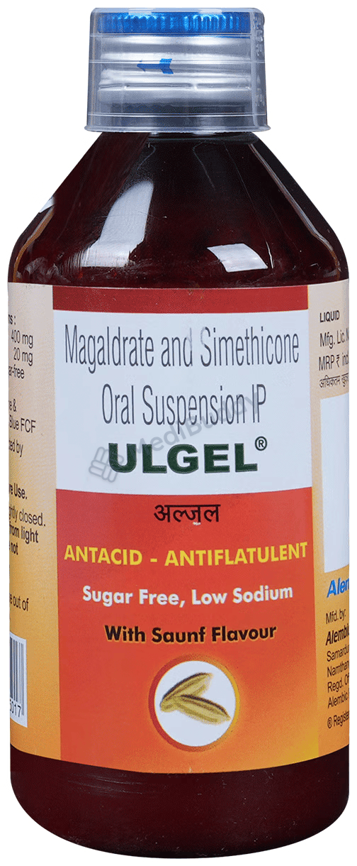 Ulgel Oral Suspension Saunf Sugar Free is a specialized combination medication designed to address common gastrointestinal issues such as acidity, stomach ulcers, and bloating. One of its primary functions is to neutralize excessive acid present in the stomach, thereby aiding in the comfortable passage of gas, relieving discomfort.