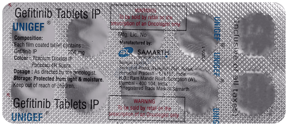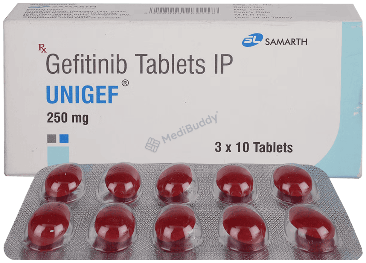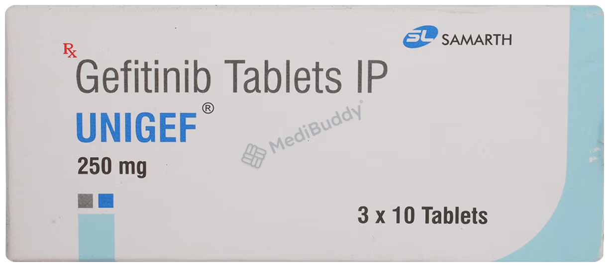 Unigef 250mg Tablet is used to treat non-small cell lung cancer (NSCLC), a type of lung cancer where cells in the lung grow uncontrollably. Smoking increases the risk of NSCLC. Symptoms include a persistent cough and shortness of breath. The cancerous cells can spread to other parts of the body through the bloodstream.
