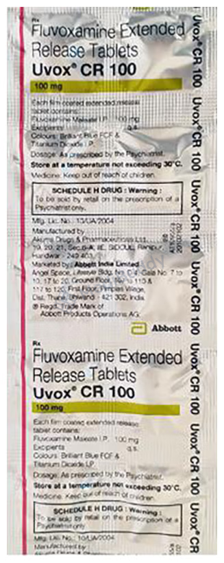 Before consuming Uvox CR 100mg Tablet, it is crucial to follow your doctor's instructions carefully. This antidepressant, classified as a selective serotonin reuptake inhibitor (SSRI), is primarily used to treat depression and obsessive-compulsive disorder. Your doctor will determine the appropriate dosage and frequency tailored to control your symptoms effectively. It's essential not to adjust the dose or cease taking the medication abruptly without consulting your doctor, as this may worsen your condition or lead to unpleasant withdrawal symptoms like anxiety, restlessness, palpitations, or sleep disturbances.