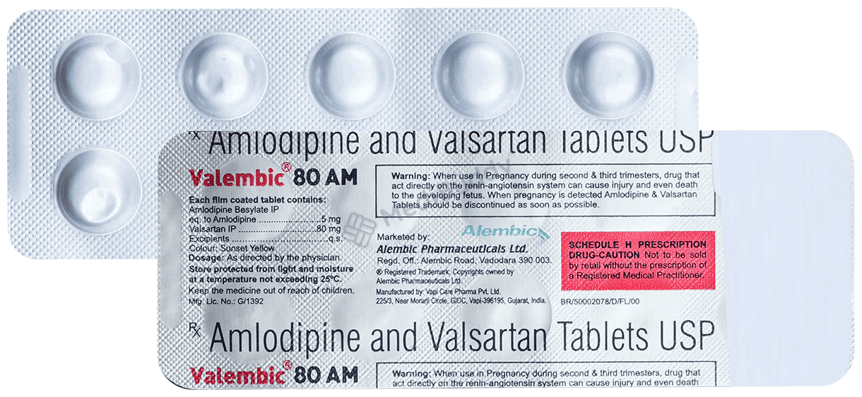 Valembic 80 AM Tablet, which contains Amlodipine and Valsartan, offers several benefits when used to treat hypertension (high blood pressure). Both these medicines work in different ways to lower blood pressure. Amlodipine, a calcium channel blocker, and Valsartan, an angiotensin receptor blocker, work together to relax and widen blood vessels. This dual action makes it easier for your heart to pump blood effectively throughout your body, resulting in lower blood pressure levels. By keeping your blood pressure under control with Valembic 80 AM Tablet, you can reduce the risk of potentially serious conditions such as heart attacks, strokes, and kidney problems. It is important to take this medication regularly as prescribed to experience its full benefits. While you may not feel an immediate effect from taking Valembic 80 AM Tablet, it works over time to help maintain your overall well-being and cardiovascular health. By incorporating this medication into your treatment plan, you can actively manage your hypertension and improve your long-term health outcomes.