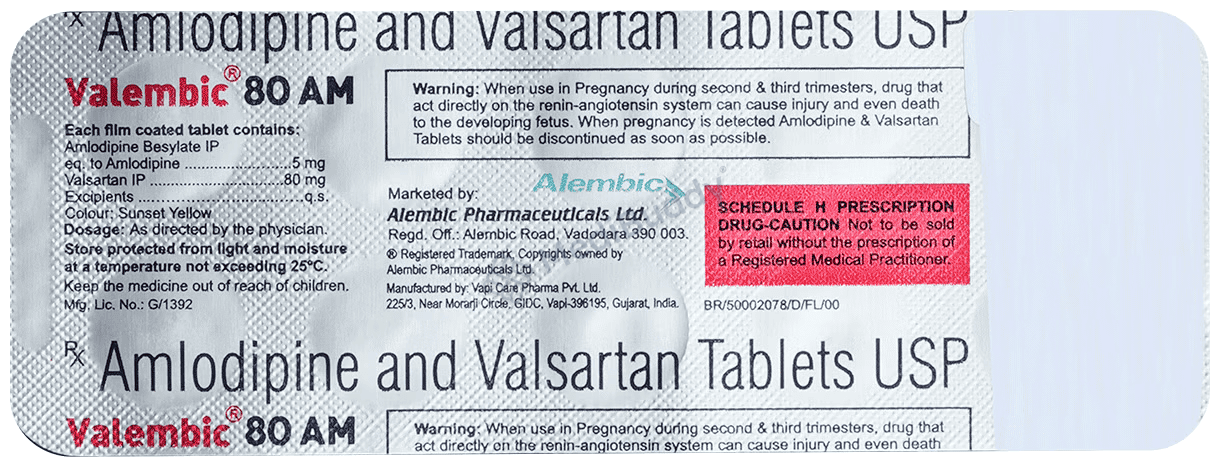 Valembic 80 AM Tablet is not recommended for pregnant or breastfeeding women, and caution is advised for individuals with specific medical conditions such as heart, liver, or kidney problems. Additionally, patients with diabetes, low blood pressure, or severe dehydration due to vomiting or diarrhea should inform their doctor before commencing treatment. The most prevalent side effects of Valembic 80 AM include low blood pressure, dizziness, tiredness, headaches, sleepiness, swollen ankles, and flushing. If any of these effects worsen or persist, seeking medical advice is recommended.