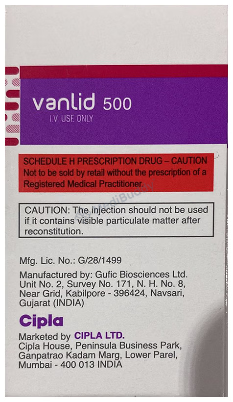 Common side effects associated with Vanlid 500 Infusion 1's encompass application site reactions like pain, redness, and swelling, usually resolving over time without requiring medical intervention. Individuals with liver or kidney diseases, hearing problems, or stomach/intestinal disorders should disclose these conditions to their doctor before commencing treatment with Vanlid 500 Infusion 1's. Caution is advised when using this medication alongside live bacterial vaccines to prevent any interference with vaccine efficacy. Pregnant and breastfeeding women must seek medical advice before initiating treatment. Alcohol consumption should be avoided when using this medication to avert any potential adverse effects. Children should only use Vanlid 500 Infusion 1's under a doctor's prescription, based on their age and body weight.